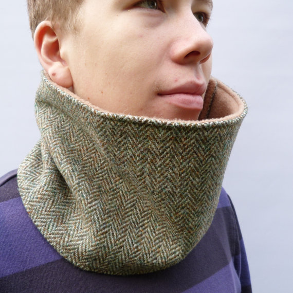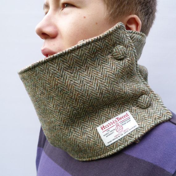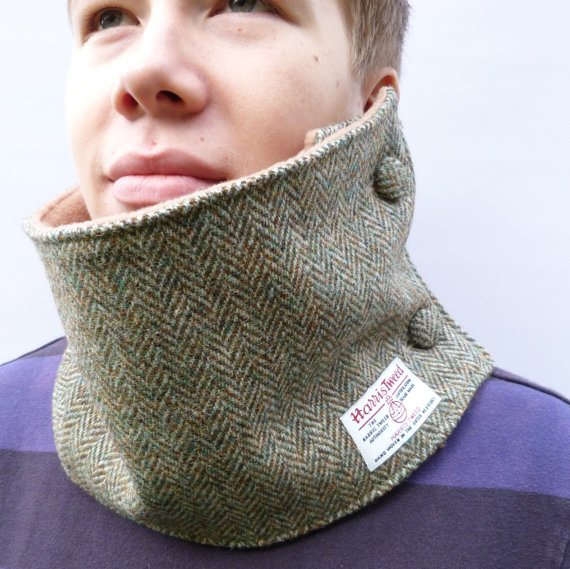 Stunning mens neckwarmer handmade from this superb quality genuine Harris tweed fabric, herringbone in design woven with green and beige colours. For snugglyness the neckwarmer is fully lined with a good quality grey polar fleece fabric. The neckwarmer fastens with 2 coordinating handmade buttons.