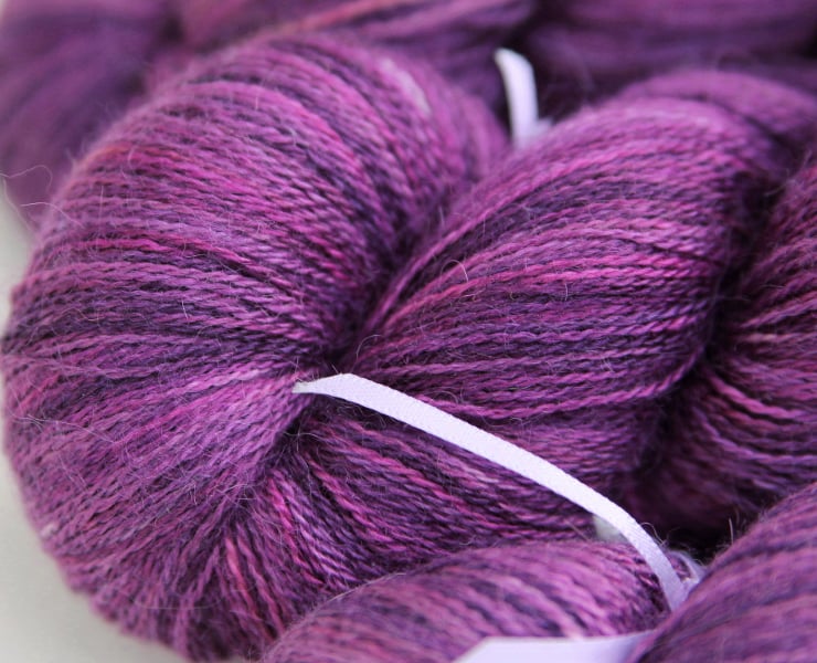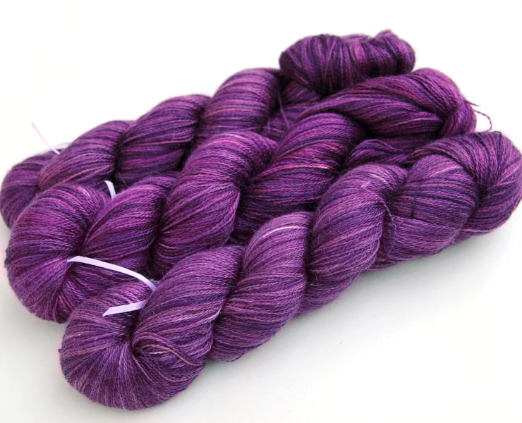 Shades of violet-purple to byzantium purple, with touches of dark magenta and hints of copper and berry shades. These are beautiful skeins that are hard to describe and photograph! The second photo is probably the most accurate for colour. This gorgeous and luxurious yarn has the softness and warmth of alpaca with the smooth sheen and cool feel of silk. It should make beautiful lace projects. There is one skein left. Photos taken and edited in bright natural light.