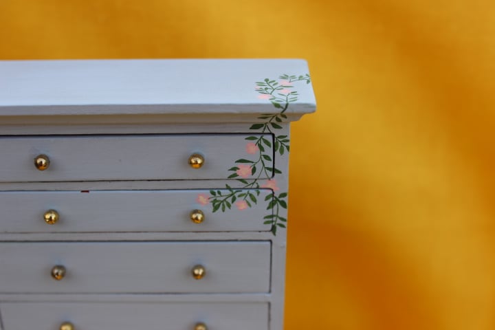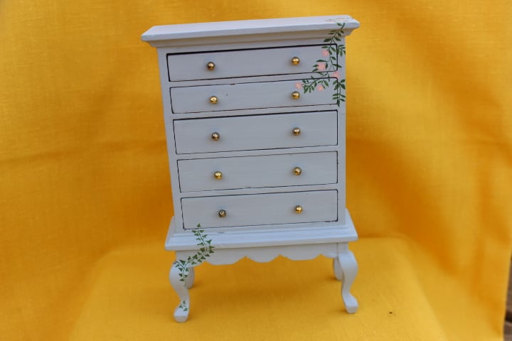 12th Scale Tallboy with opening drawers in pale blue, handpainted with a country floral decoration of Foxgloves, Ivy and Dog Roses. 135mm x 85mm.