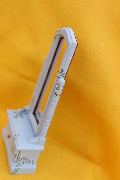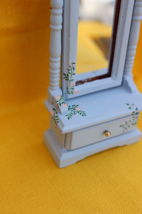 12th scale, full length tilting mirror with open drawer. Pale blue handpainted decoration of Ivy and Dog Roses. 140mm x 60mm.