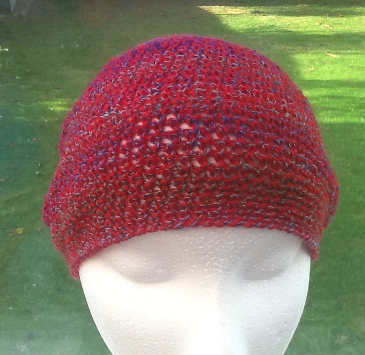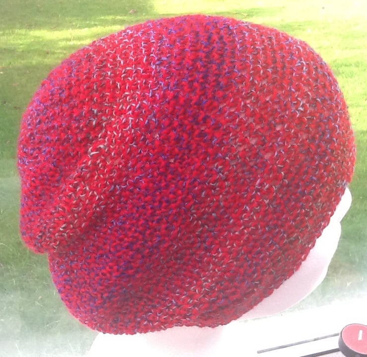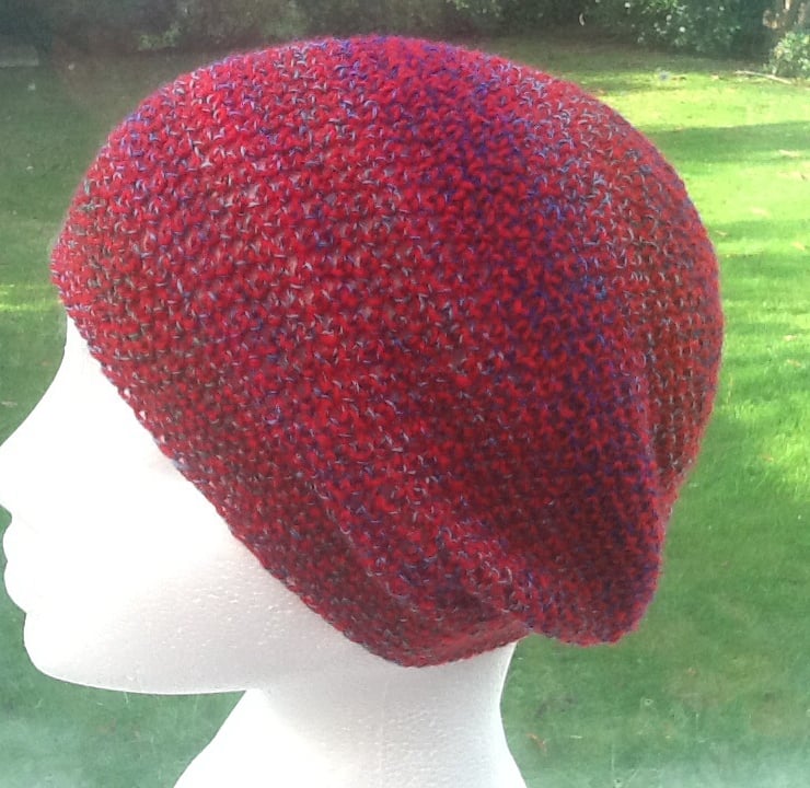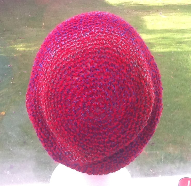 A very pretty cranberry red slouchy, or loose beret crocheted hat, with green and blue rainbow effect!