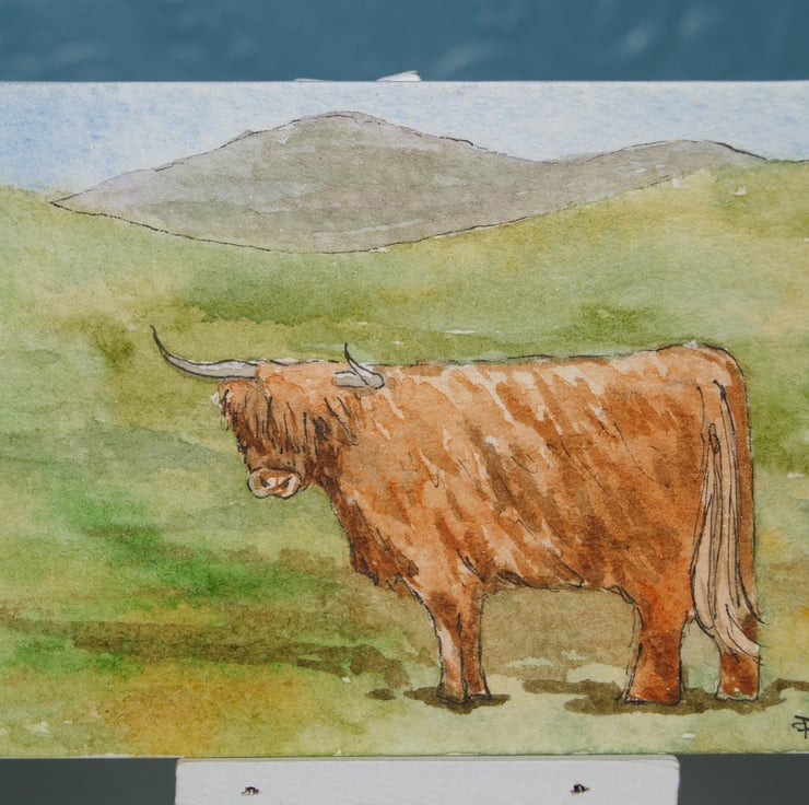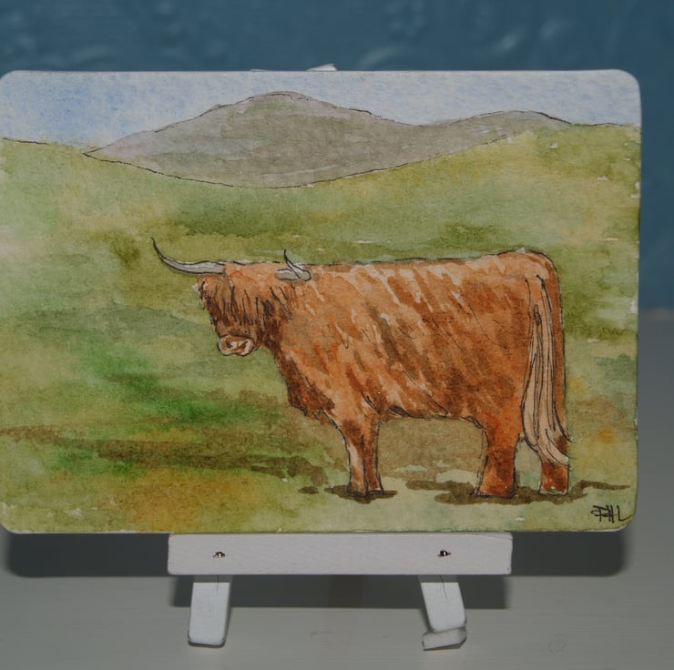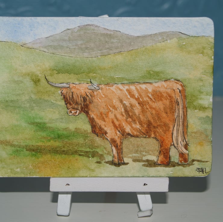 This ACEO is an original, hand painted watercolour of a Highland cow in Scotland. It measures 2.5 x 3.5 inches (63 x 89mm).