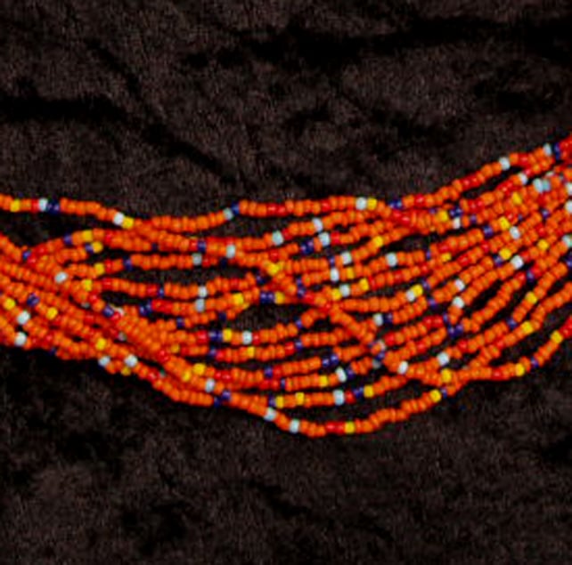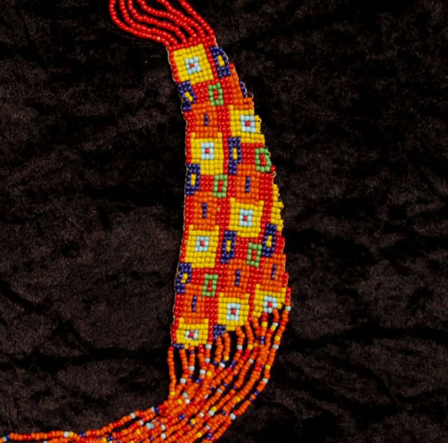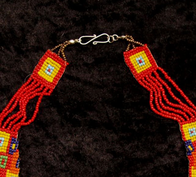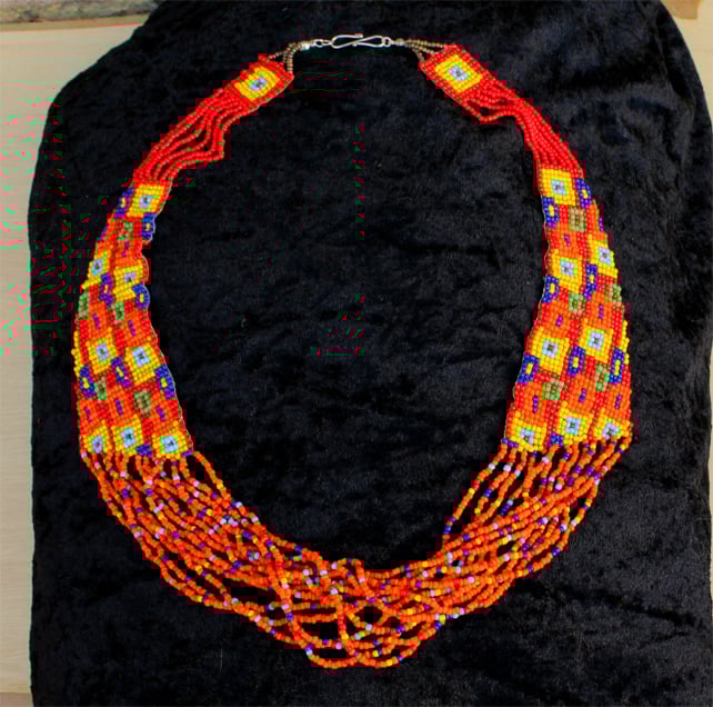 A gorgeous piece of color work, stitched on a loom using tiny seed beads. Inspired by art works of the 1920's. The necklace is a combination of tapestry panels and threads of beads, giving both order and chaos in beautiful colors. The necklace is 65cm long and hangs widely rather than straight down. It is 5cm at the widest and fastens with a silver hook