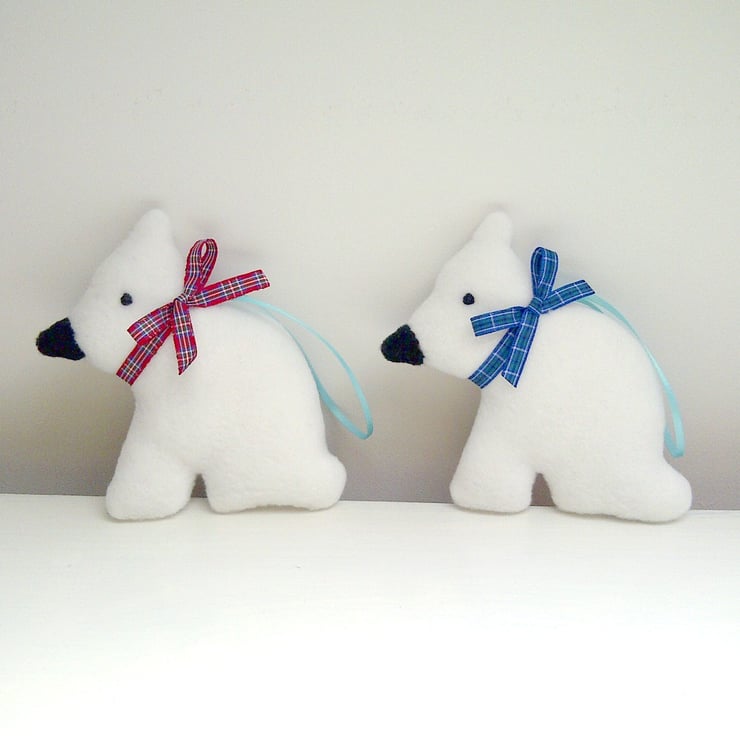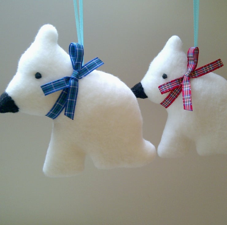 Made from white fleece, with black fleece noses, each has a light turquoise hanging ribbon and a blue or red tartan ribbon bow around their necks. The eyes are sewn using black embroidery thread.