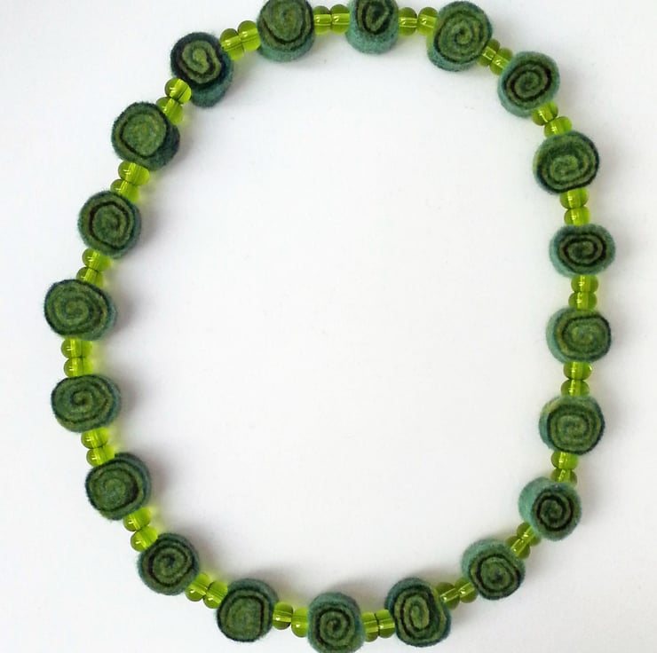 I make the felt beads in colour combinations that I like and then combine them with other beads to complete the necklace. The colours in the felt beads spiral round each other. Here I have used transparent green glass beads to go with the felt beads. The shiny glass beads complement the matt nature of the felt. The necklace is strung on elastic cord.