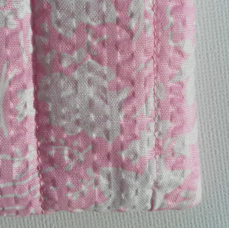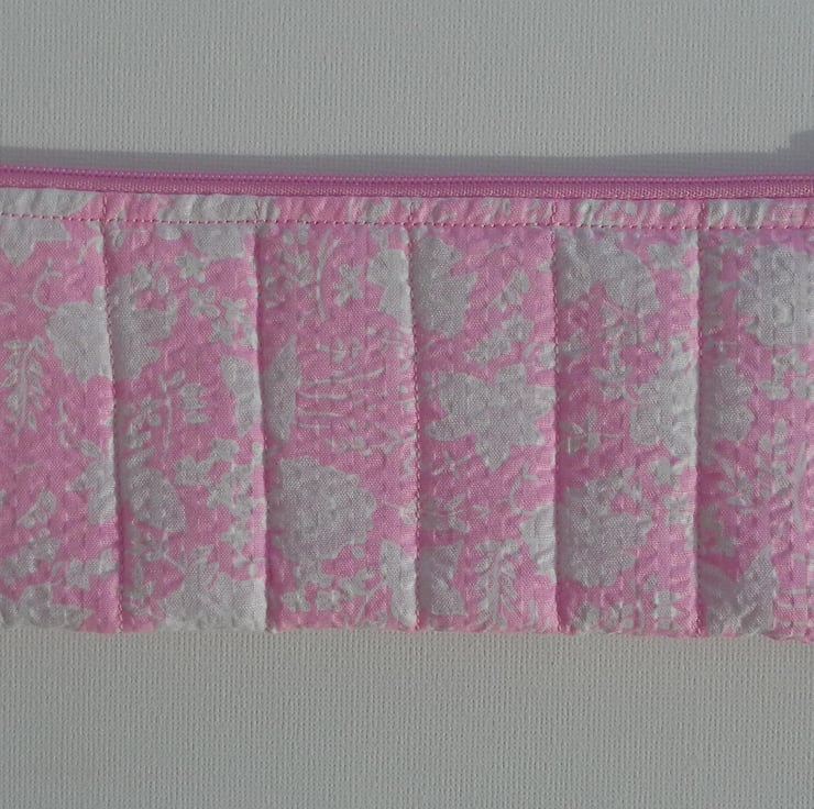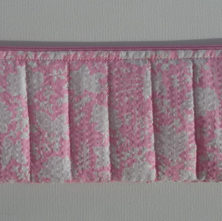 This very cute, quilted make up bag or pencil case is perfect for a handbag. It is pink with a lilac and white floral pattern with a pink zip and pink lining. The case measures