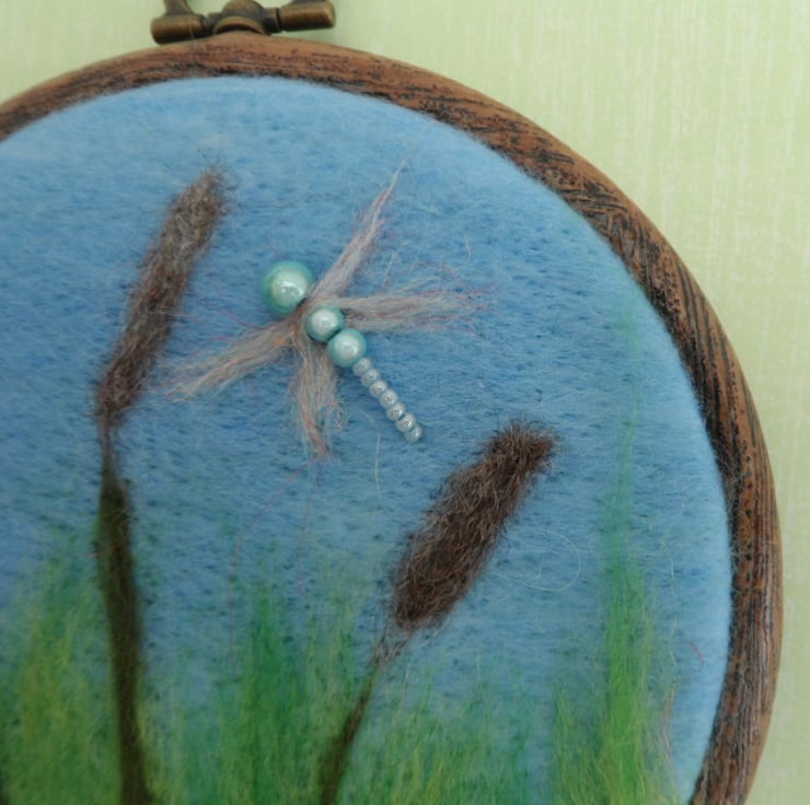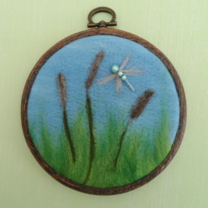 Painting with wool, this picture has been needle felted using merino wool on a felt background. A blue beaded dragonfly with needle felted wings flitting among some needle felted bulrushes. This picture has been mounted in a 5" diameter circular flexiframe.