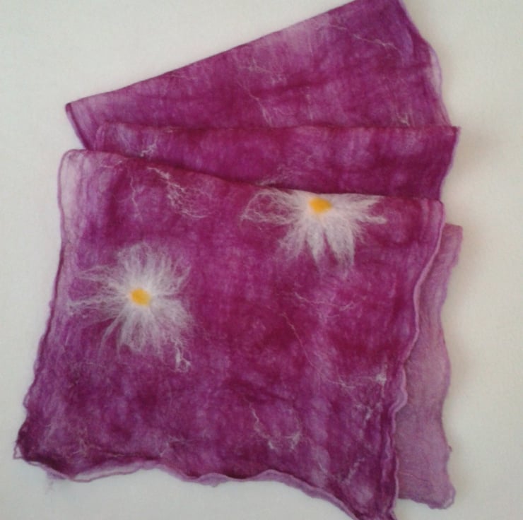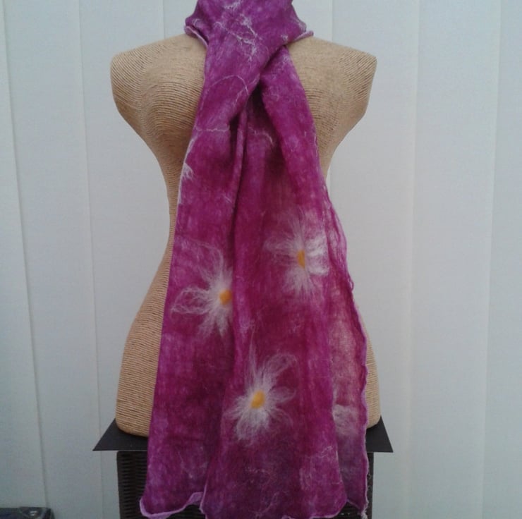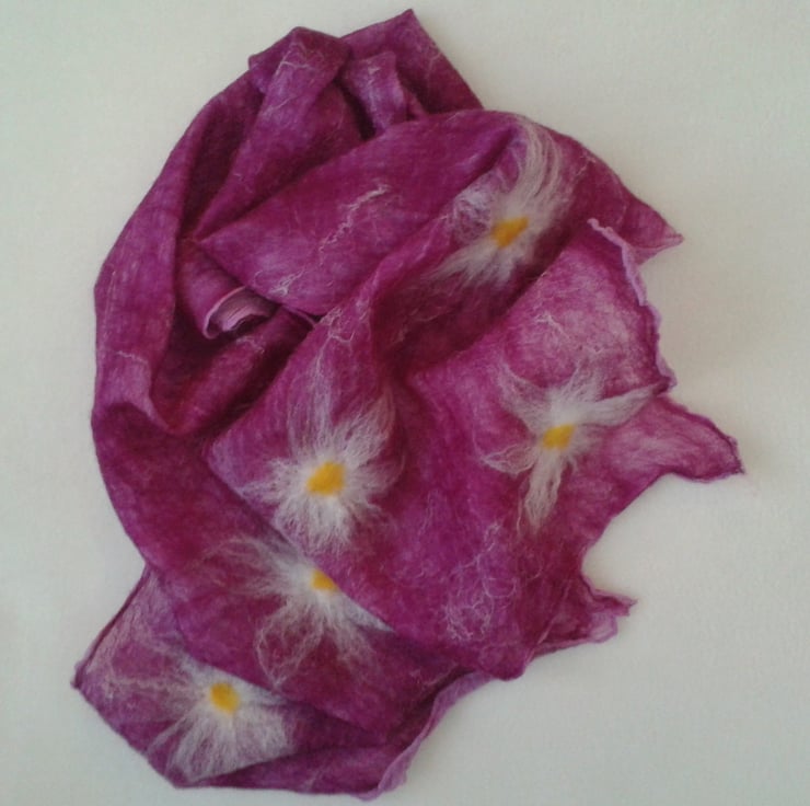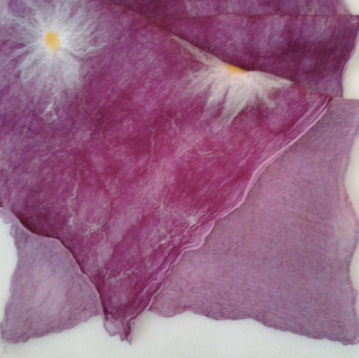 Nuno felted onto a pale purple silk scarf a base layer of pale purple wool has had pale pink silk strands added to the surface and three large felted daisies at each end of the scarf. This scarf has been felted on one side only leaving the silk scarf visible on the reverse. Shrinkage of the wool in the felting process results in a lovely crinkled effect to the silk.