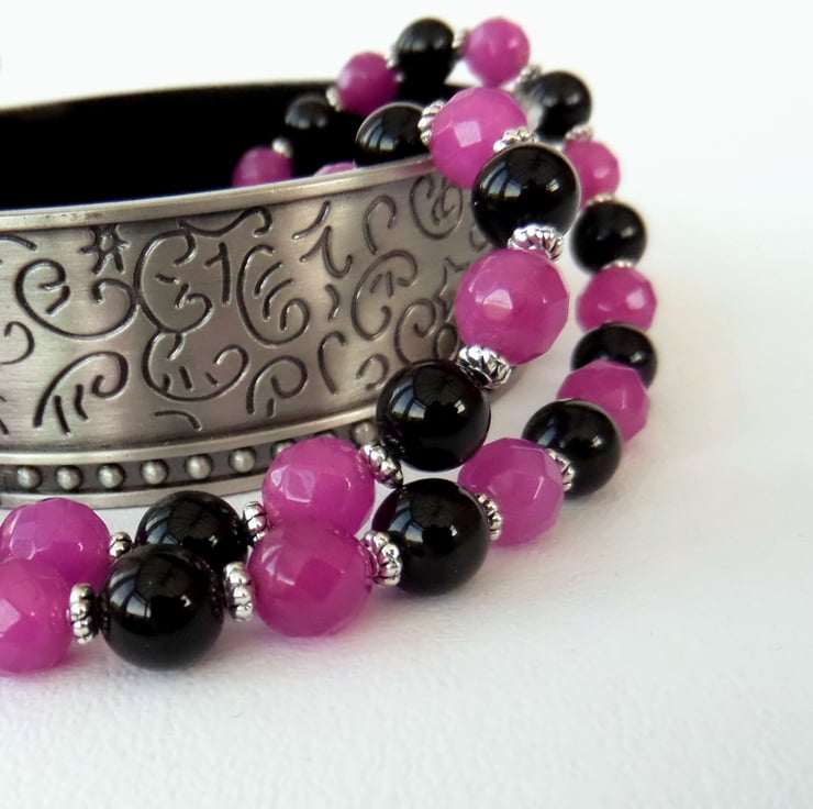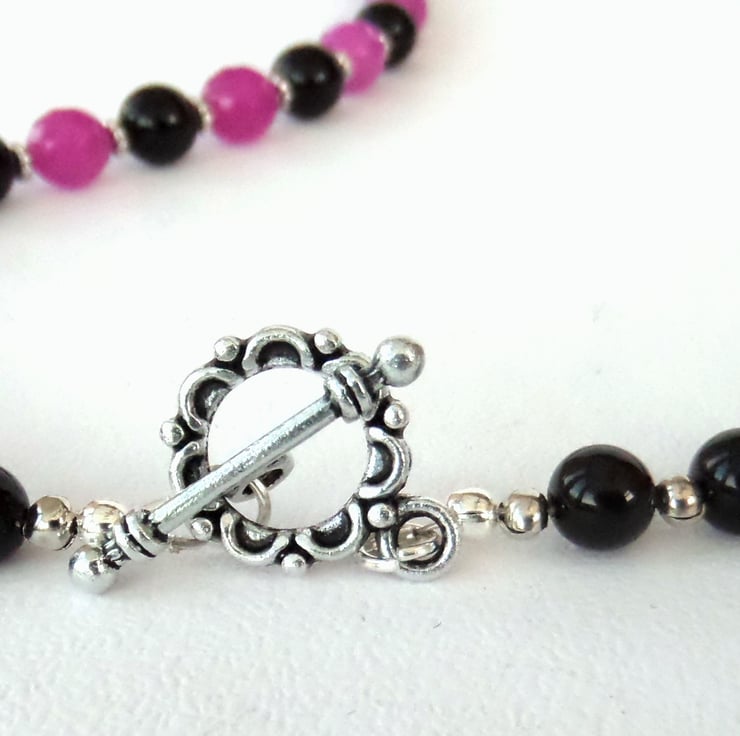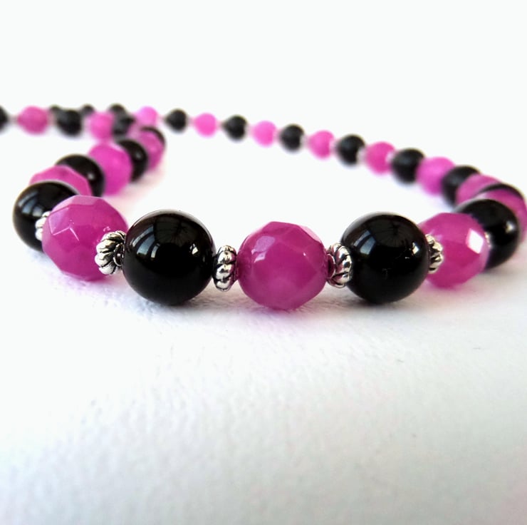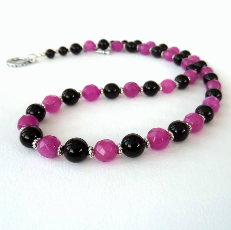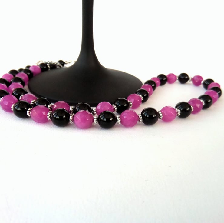 Beautiful pink jade and black onyx 8 mm semi-precious gemstones combine to made this stunning necklace.