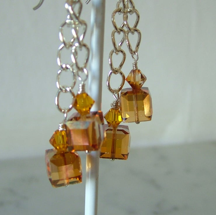 They are 9 mm Topaz Swarovski Cubes and 5mm Topaz Swarovski Bicones