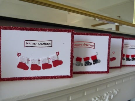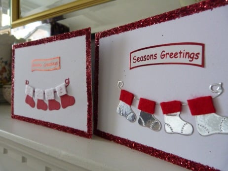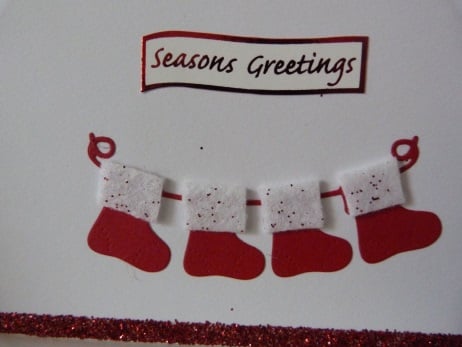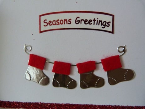 A pack of 4 cards consisting of two each of two colourways. A cute row of 4 stockings die cut from quality silver mirri and red card mounted onto quality white card. Stocking tops have been hand cut from contrasting felt either white glitter or red. All the edges have fine red glitter. Finished off with a festive tag.