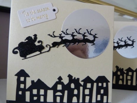 A pack of 5 cards all of the same design consisting of a santa and his sleigh pulled by his reindeer all die cut from black glitter card, mounted onto quality pale gold card. A huge silver moon which the reindeer are pulling the sleigh past and they are flying over a row of houses die cut from black card. Finished off with a festive tag with a black rhinestone decoration.