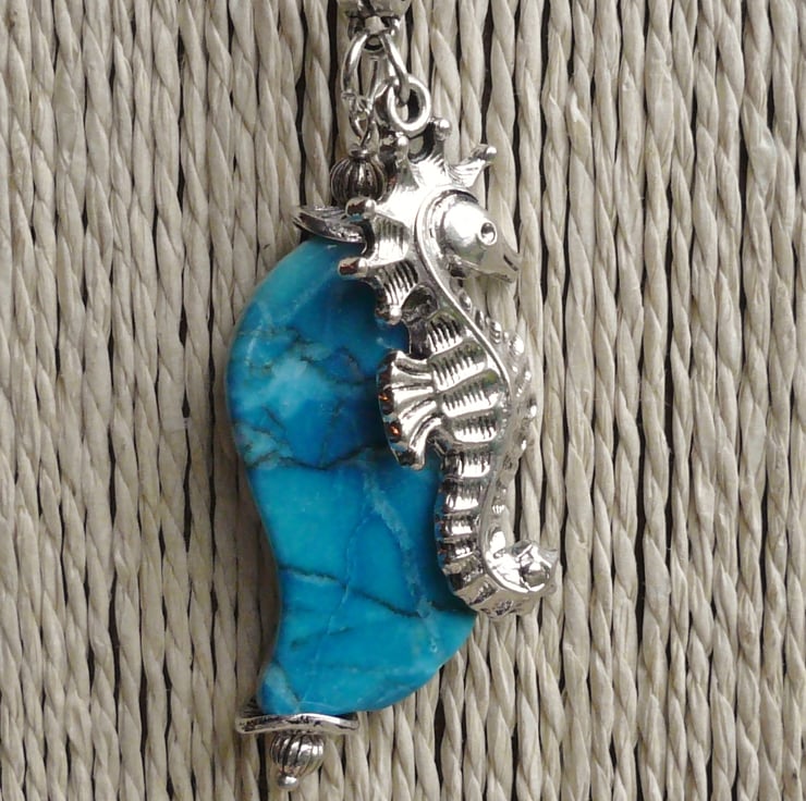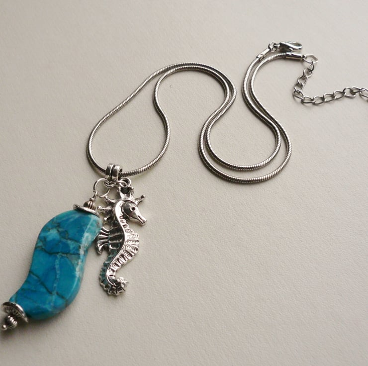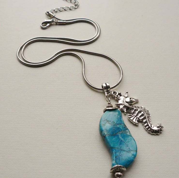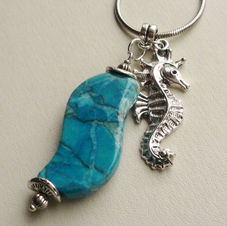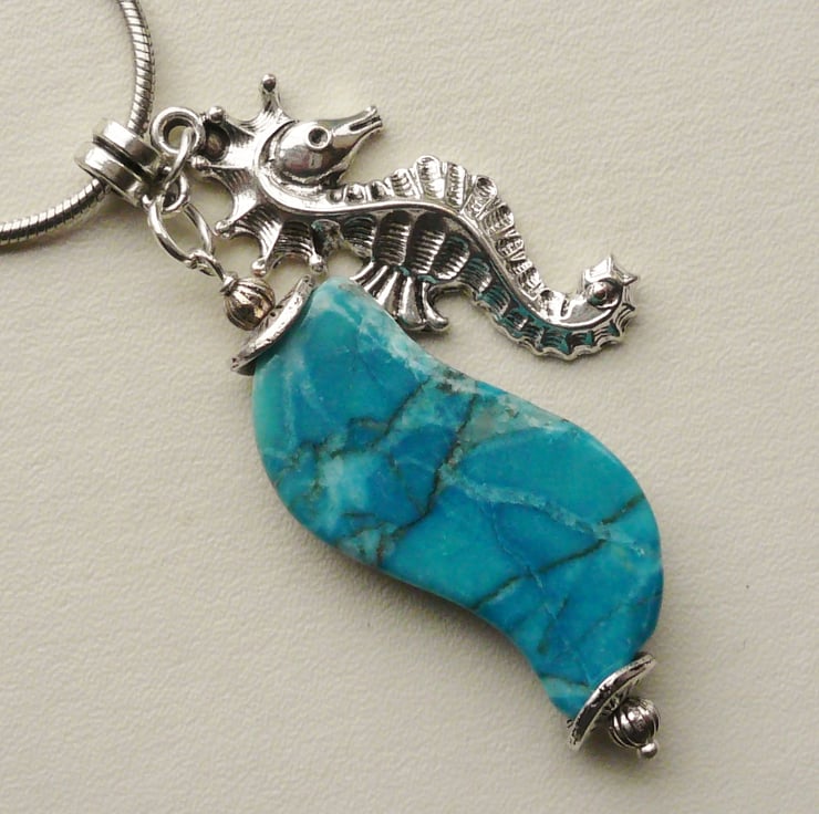 This necklace is made up of a 35mm flat 'S' shaped dyed turquoise veined jasper bead, with Tibetan silver round ribbed and 'wavy' spacers attached, teamed with a 38mm long Tibetan silver seahorse pendant. All attached by Tibetan silver pendant bail to a silver plated snake chain with 5cm long extension.