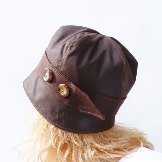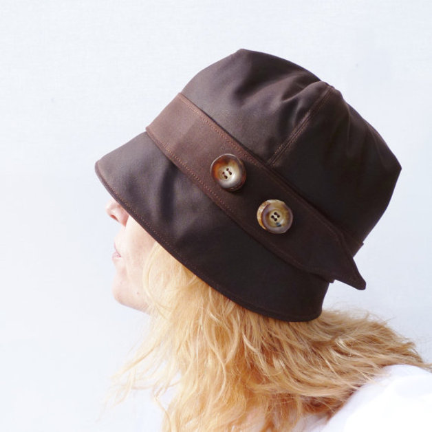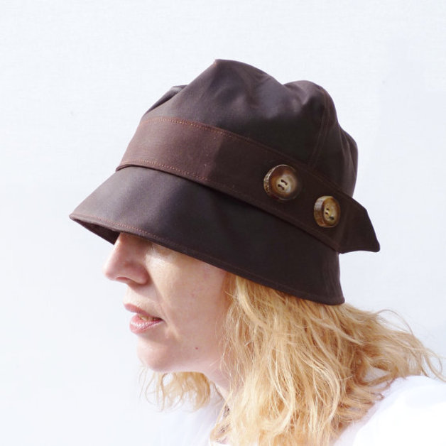 A fun yet practial rain hat handmade from a waxed brown cotton canvas fabric. The fabric has been waterproofed with a fabric waterproofing wax which gives the fabric a lovely soft sheen and a soft feel. The hat is fully lined with a cotton fabric. A decorative band and a fantastic fair trade handmade button finishes the hat off beautifully.