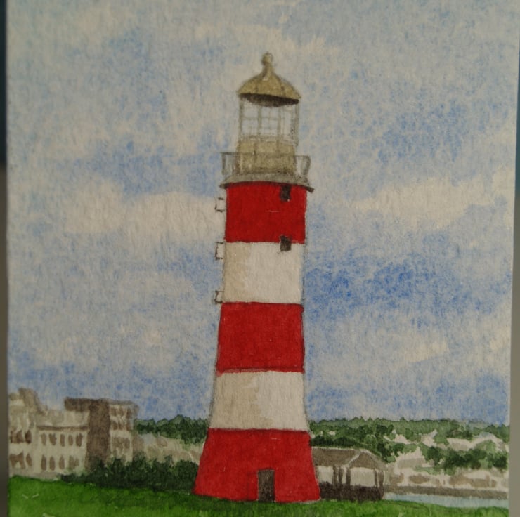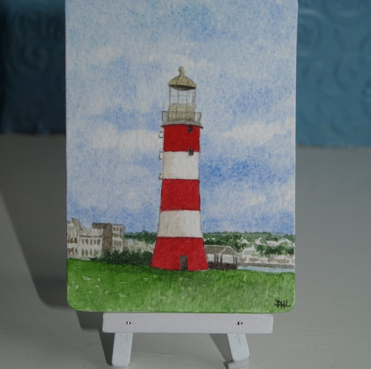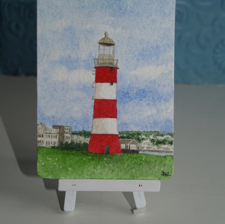 This painting is an original, handpainted watercolour of Smeaton's Tower, the lighthouse on the Hoe in Plymouth, Devon.The ACEO measures 2.5 x 3.5 inches (63 x 89mm).