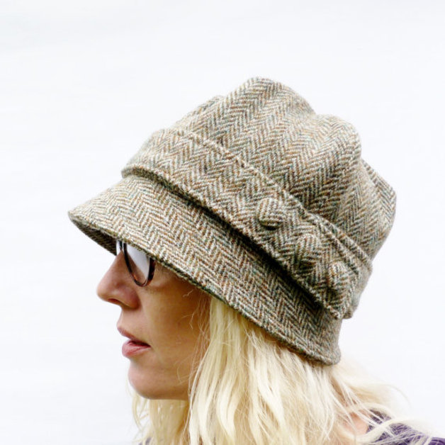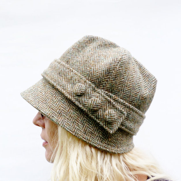 A wonderful womans cloche hat handmade from the most beautiful genuine Harris tweed fabric in a stunning green/beige colour herringbone weave . The hat is fully lined with a cotton fabric and a genuine Harris tweed label is sewn in for authenticity. A decorative band and three handmade buttons in the same fabric finish the hat beautifully.
