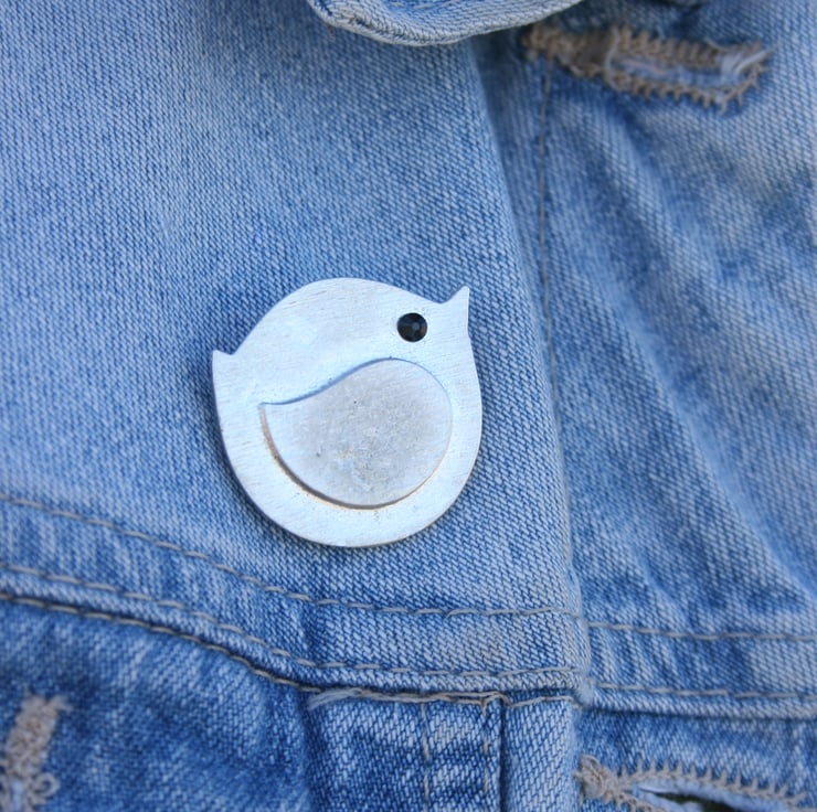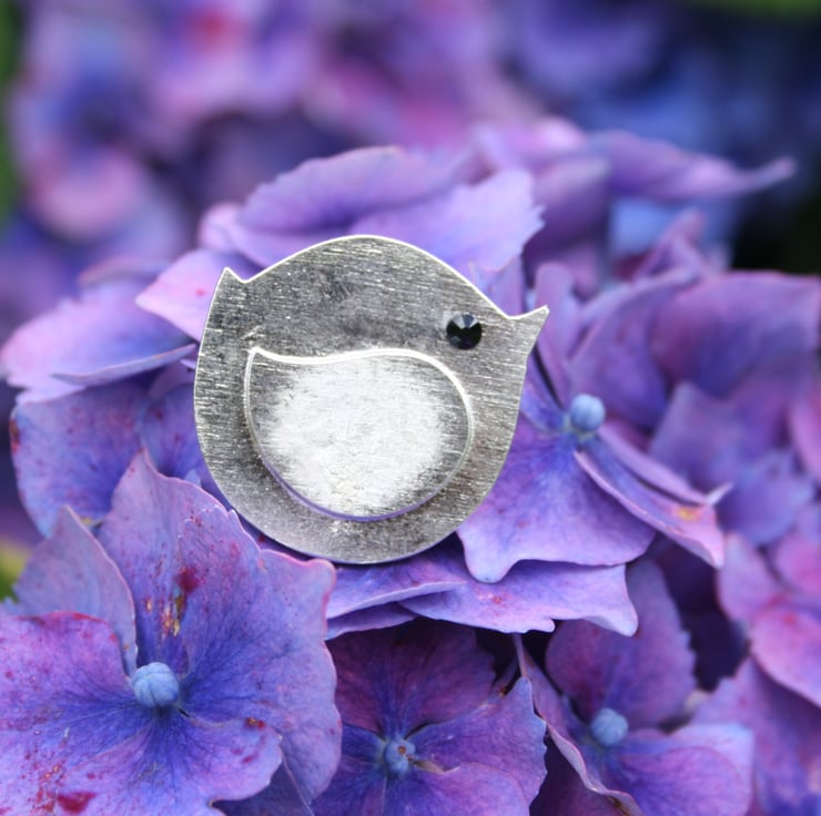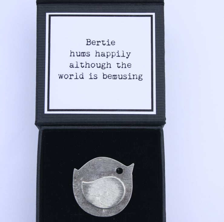 Hand-cast pewter brooch presented in a black 6cm x 6cm gift box. Bertie's vital statistics are: 3cm x 3cm and a slim 1-2mm thickness. Bertie is proud to be the owner of a 1.5cm x 1.5cm round brooch-back.