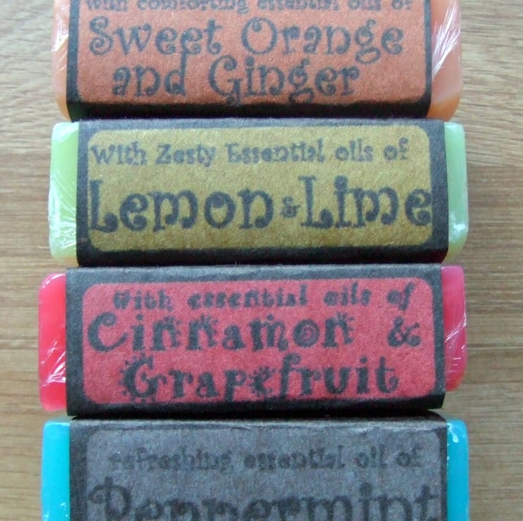 eg Peppermint "Happy Birthday to Ewe" , Orange: "Another year wiser", Lemon n Lime "Love you Grandma" Cinnamon & Grapefruit "Many Happy Returns Alice, love Becky x "