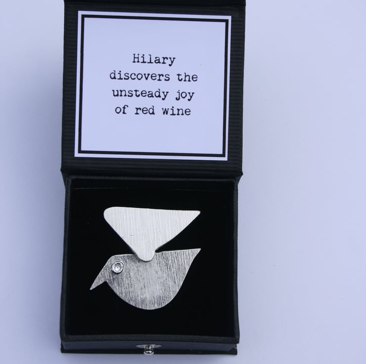 Hand-cast pewter brooch presented in a black 6cm x 6cm gift box. Hilary's wing bears the weight of the moving body beneath it. Hilary's vital statistics are a wobbly 4.5cm x 3.5cm and a thankfully aerodynamic 1-2cm thickness. Hilary would be delighted to reveal she wears a 2.5cm x 0.5 cm straight brooch-back fastening - were she sober.