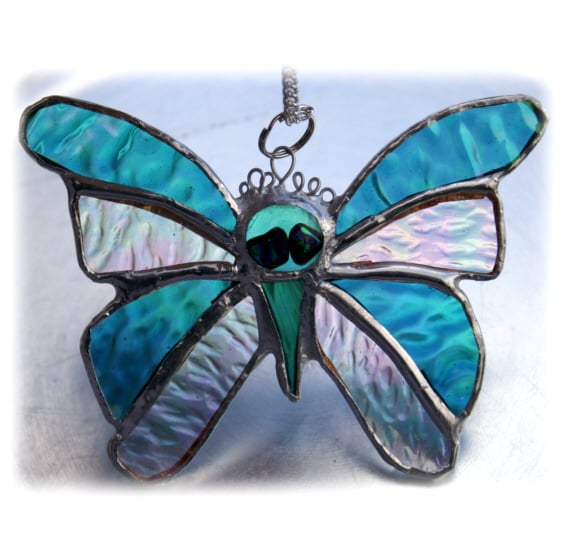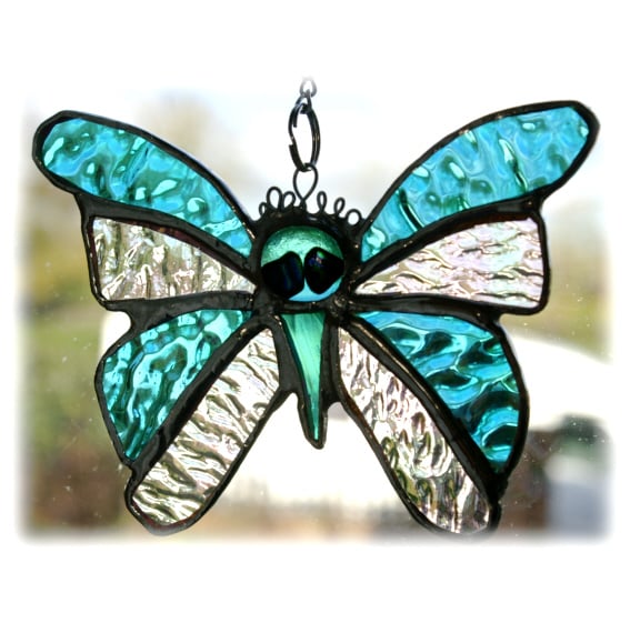 The suncatcher hangs from a little chain which is securely attached to the top of the butterfly, to its quirky curls.