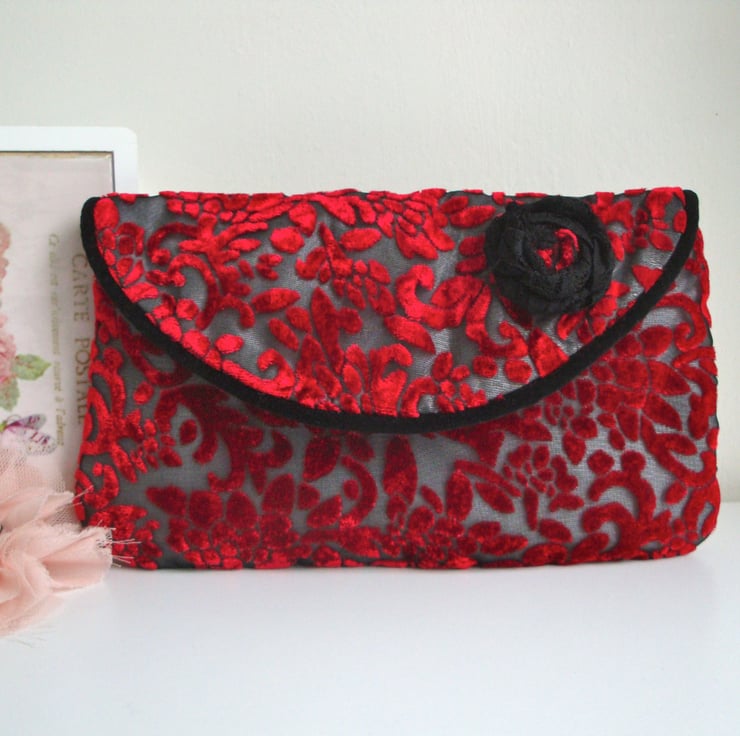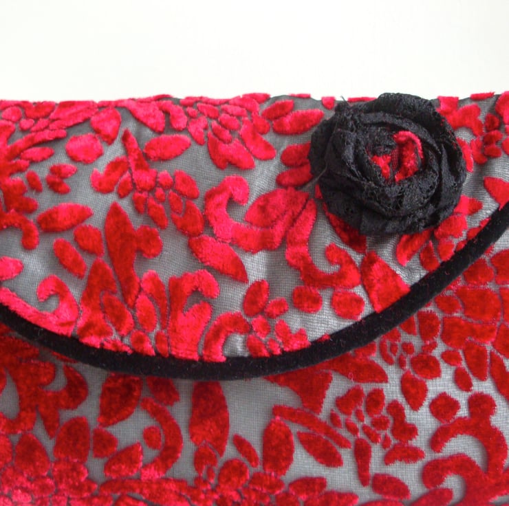 Handmade in a wine coloured Devore velvet and cream taffeta ( interfaced ) . Front flap has been piped in a black velvet fabric , and embellished with a handmade black lace flower .