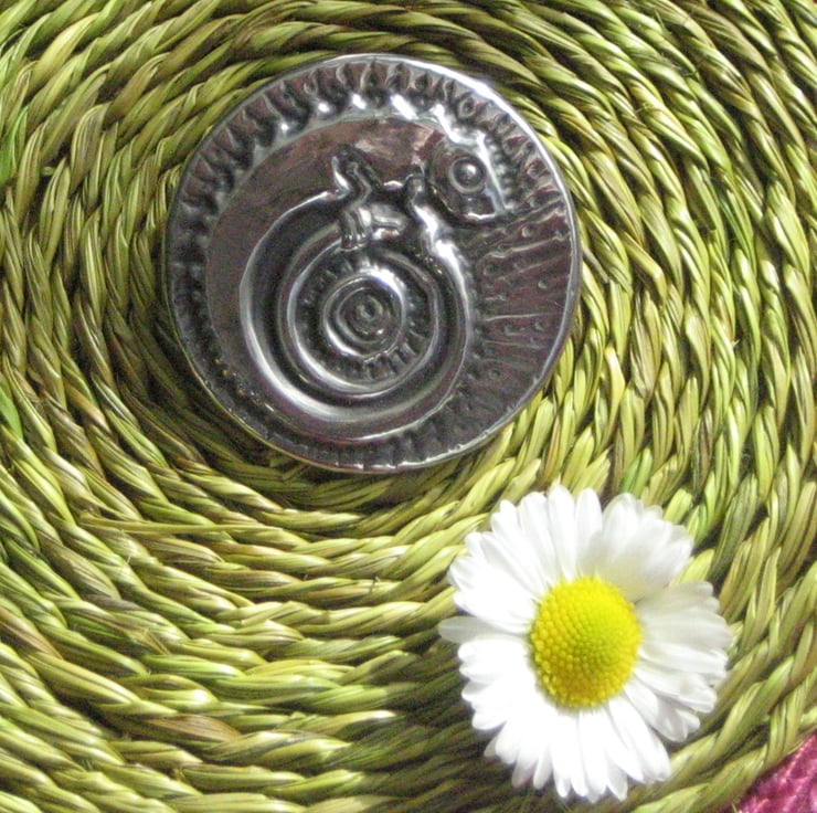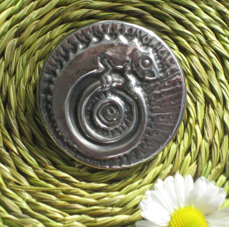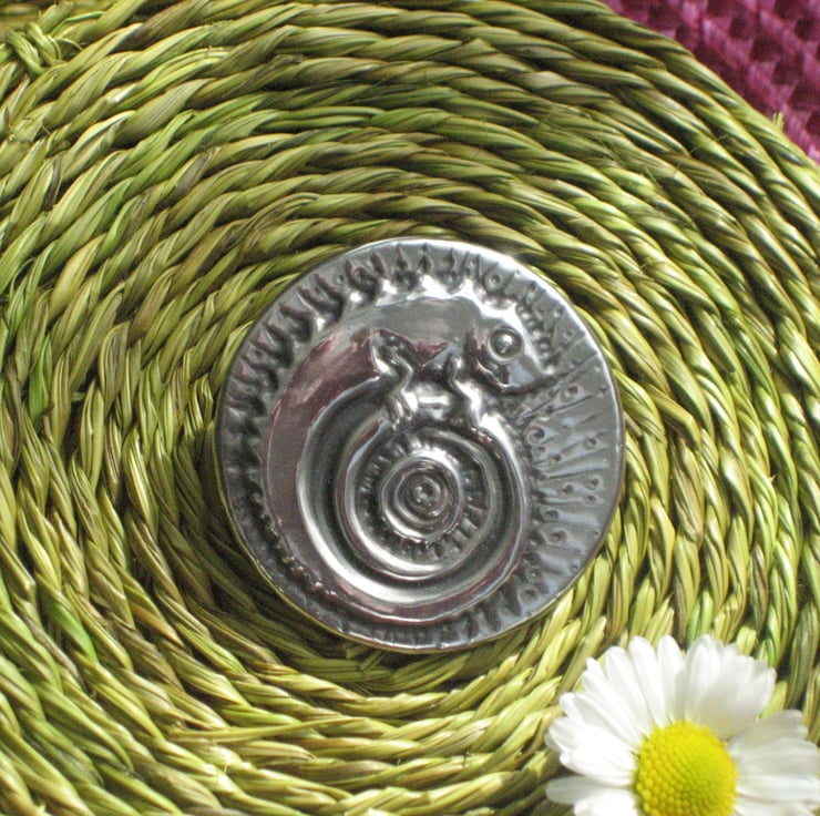 Each pewter piece has been individually made by hand (not cast) to my own design. A pattern is raised on a sheet of pewter, then the raised area is filled. The item is then mounted on a rigid base,chemically patinated, then polished.Modern pewter is lead-free and after patination has a shiny,almost reflective,finish.It does not blacken like silver and can be brightened, if necessary,with a smear of metal polish and a buffing with a soft cloth.