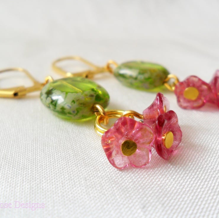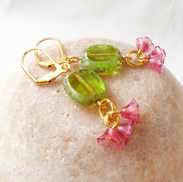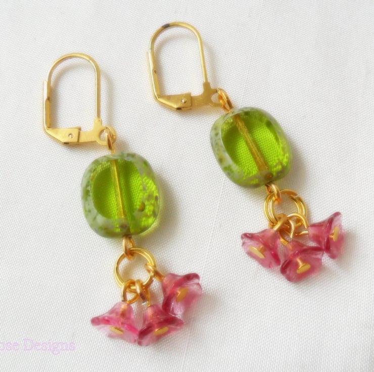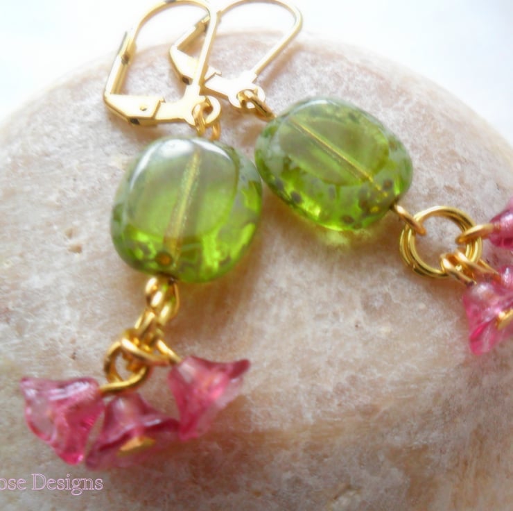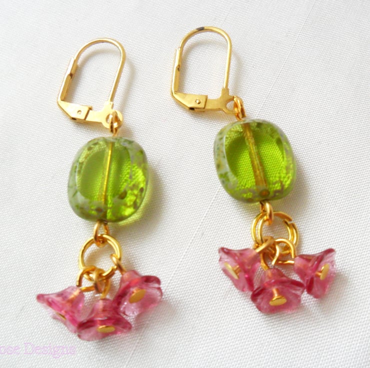 These are such pretty earrings, perfect for a Wedding or Prom! Handmade using 14 mm olive flat green Czech glass beads and a trio of tiny flower cup beads in deep pink. Hanging from gold-plated lever-back ear wires, these earrings have a drop of 2" (5 cm).