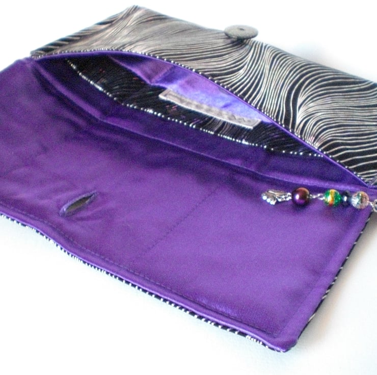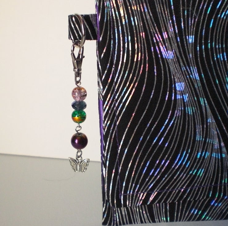 The lining is a lovely purple satin and there are 3 slip pockets inside across the whole width of the bag. There is a pretty bag charm attached to one side of the bag, which is removable.