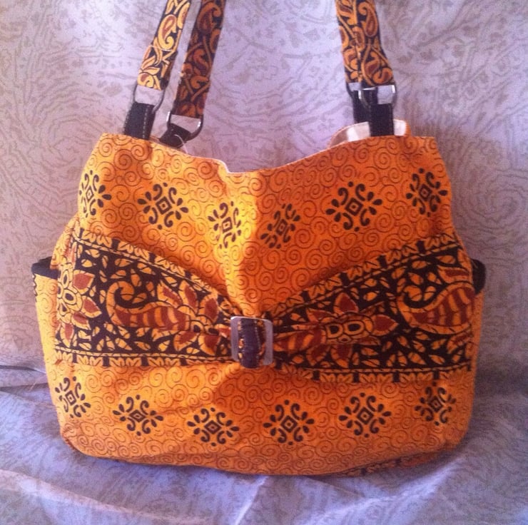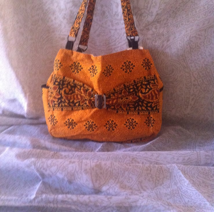 Lovely african print bag with magnetic snap closure, inner Velcro tab. Decorative bow with buckle. Long shoulder handles.