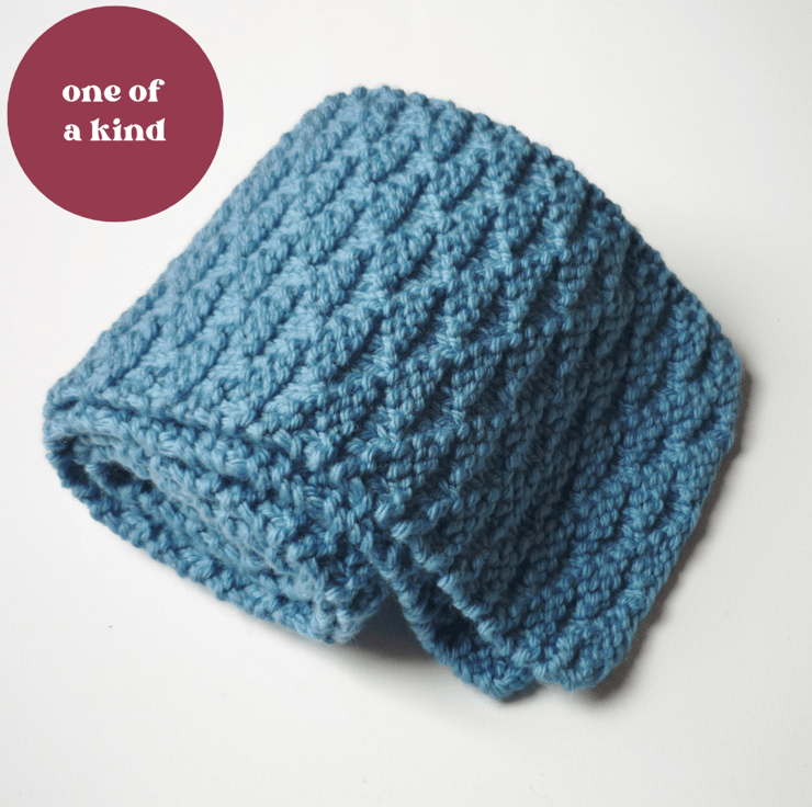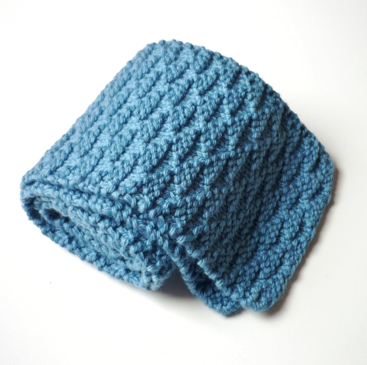 My hand knitted scarf is soft to the touch and comfortable to wear. It is made of 100% wool for breathability in a beautiful blue colour. It measures 12cm x 117cm (5in - 46in) - a generous size for a toddler and a tighter fit for a younger teen.