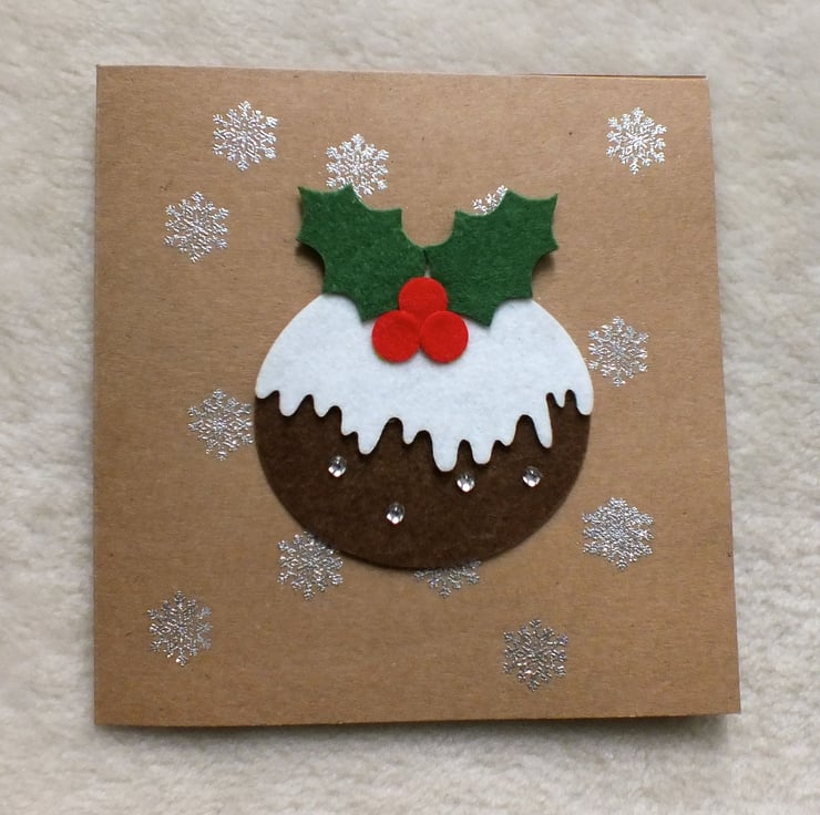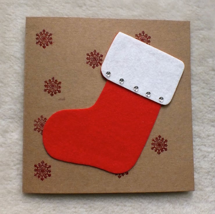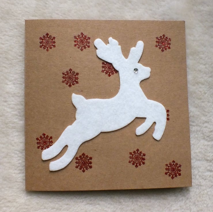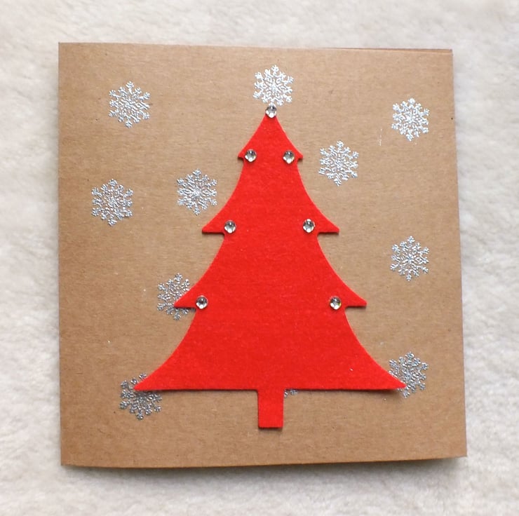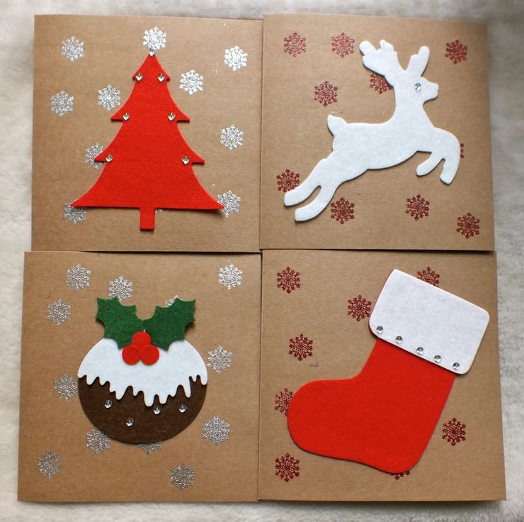 These cards have been made using kraft card for an organic feel, and the snowflakes have been lovingly hand printed and heat embossed, which shimmer in the light, providing added texture. This listing is for a pack of four cards, one of each felt design. Includes the sentiment ‘Merry Christmas’ inside. Each card is approx. 6”x6”.