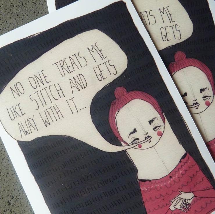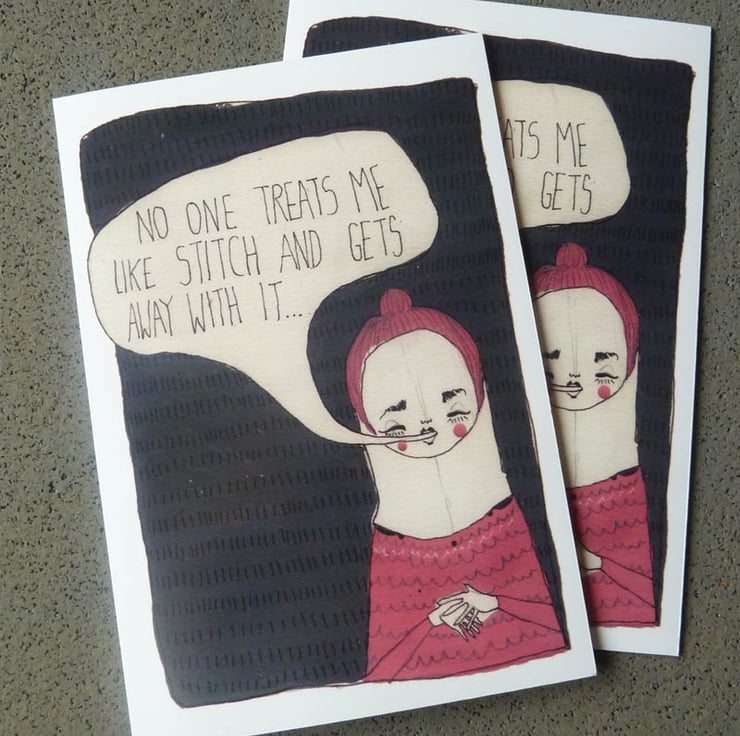 This listing is for one of these lovely illustrated cards. The card is approximately 6x4 and comes with a white envelope, protected in a plastic sleeve. The card features a print of a Twinkle and Gloom illustration. This particular illustration features a little sewing/knitting themed word play.