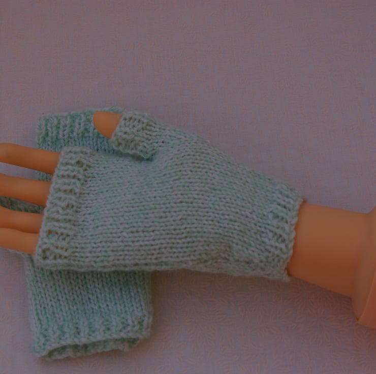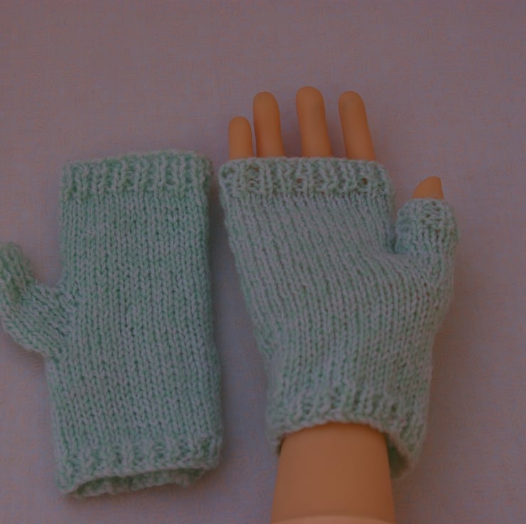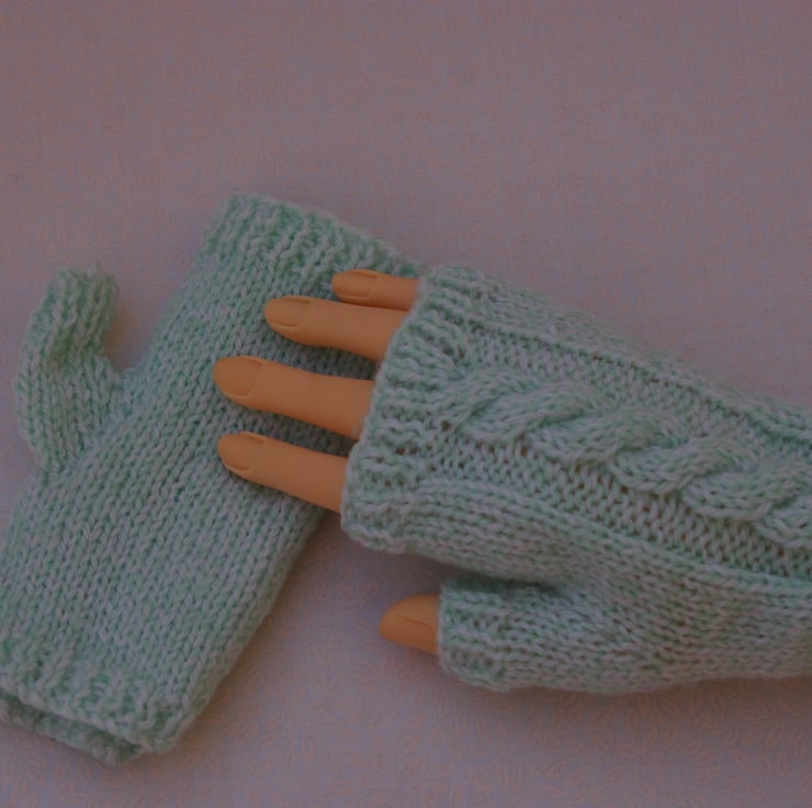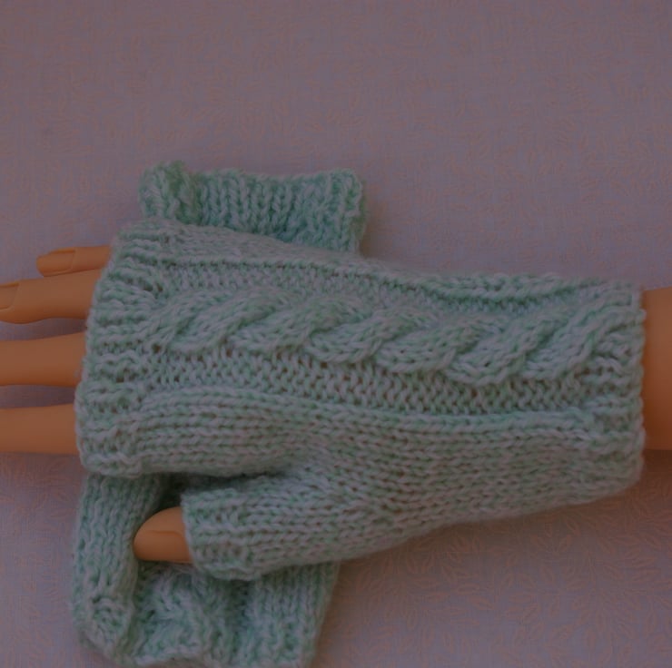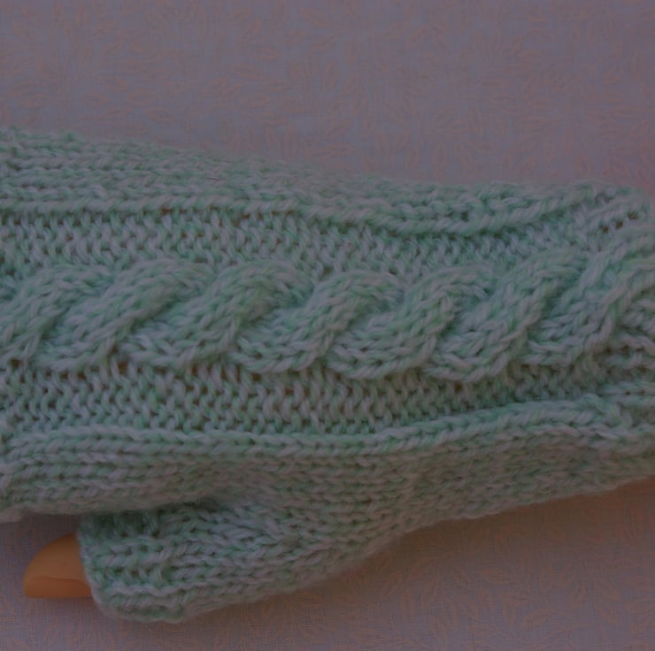 A pair of hand knitted fingerless gloves or mittens with a short cuff. The gloves are hand knitted with a single cable pattern down the outside in a light green and white variegated yarn. The yarn is a warm acrylic yarn so would suit someone who might have allergy concerns associated with animal based yarns.