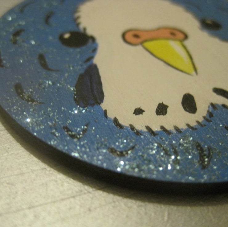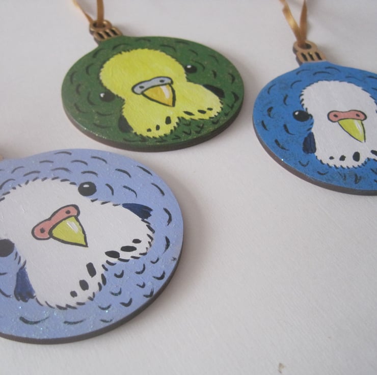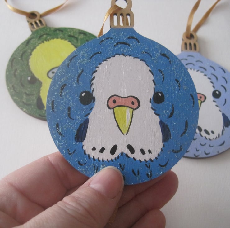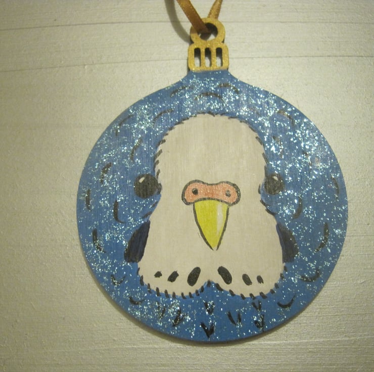 It is painted in acrylics on a flat wooden bauble shape, and is perfect for decorating the tree of a budgerigar fan.