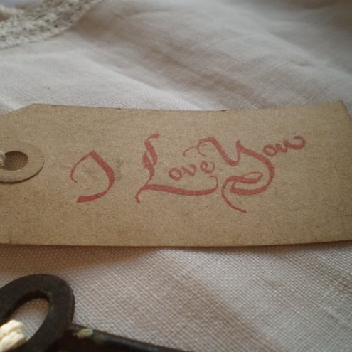 Give someone the key to your heart.... a gift tag with difference. I have "grunged" and stamped the words "I LOVE YOU" onto a luggage label. Attached is a vintage key. Tied to a gift, flowers or even a new car!!!! .... the sentiment behind it could be for your special someone. Could also be used in altered art and scrapbooking