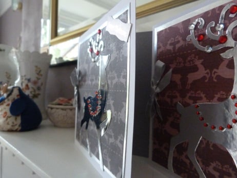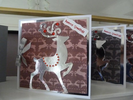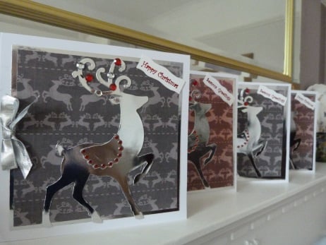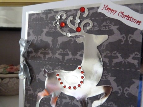 A pack of 4 quality cards all depicting a magnificent stag die cut from silver mirri card, his antlers decorated with red and silver rhinestones, and his back with red rhinestones. Mounted onto graduated stag paper, then onto silver mirri card and then onto quality white card. Finished off with a seasonal tag and a silver ribbon bow.