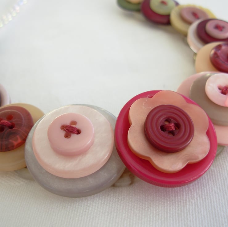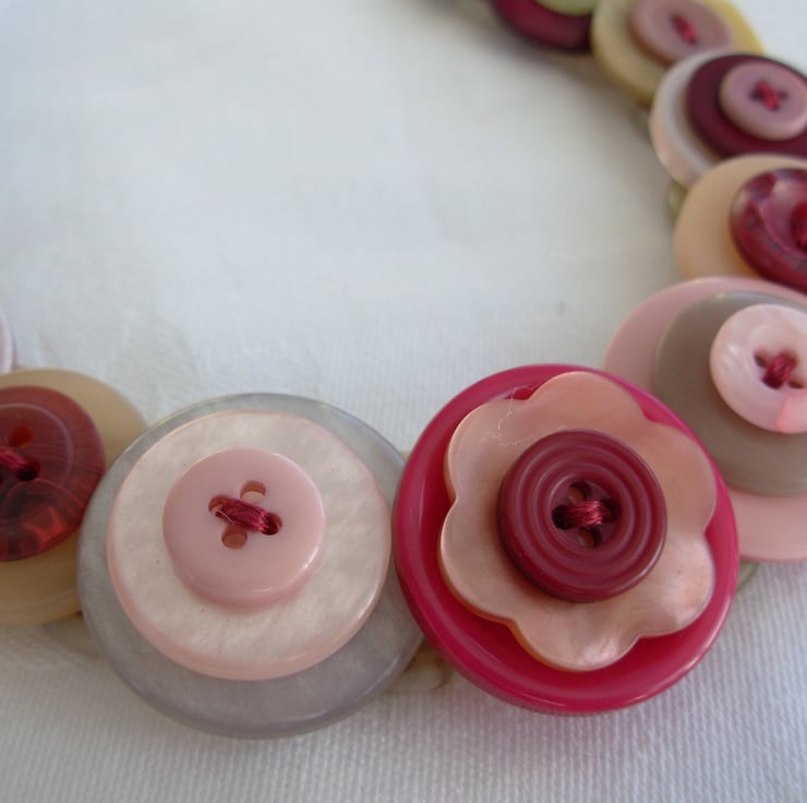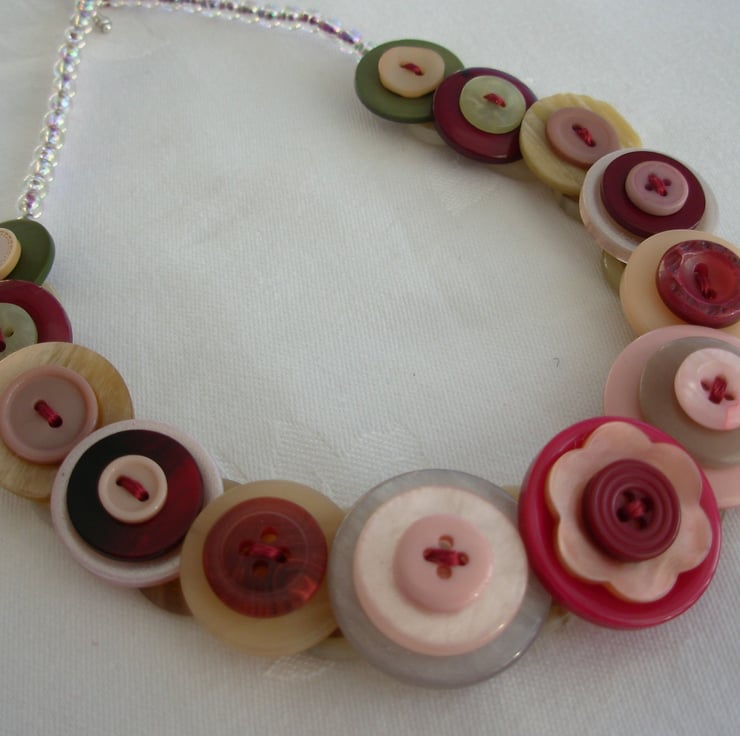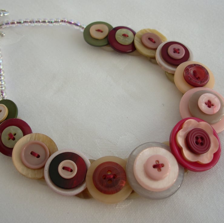 I've made this layered and stacked button necklace from assorted burgundy, cream and pink buttons threaded and knotted with 6 strands of embroidery thread and finished with little clear AB beads and toggle clasp - 17ins (43cm) long - Comes with its own little organza bag