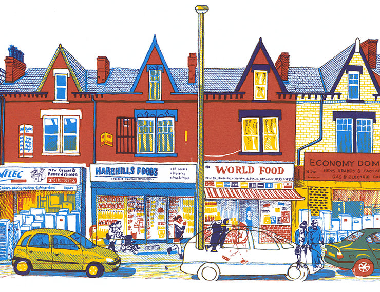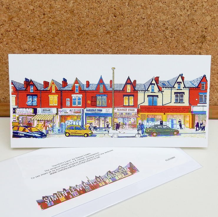 This greeting card is of the lively Harehills Lane in Leeds. The original image was a screenprinted artwork by myself, Leeds based illustrator Simon Lewis, originally produced in 2011. I was inspired by the graphic shop signage, the busyness and energy of the street, and the red brick Victorian terraces that dominate the area. The original is a 4 colour screenprint, each colour derived from a detailed drawing to give a bright and vibrant overall image.
