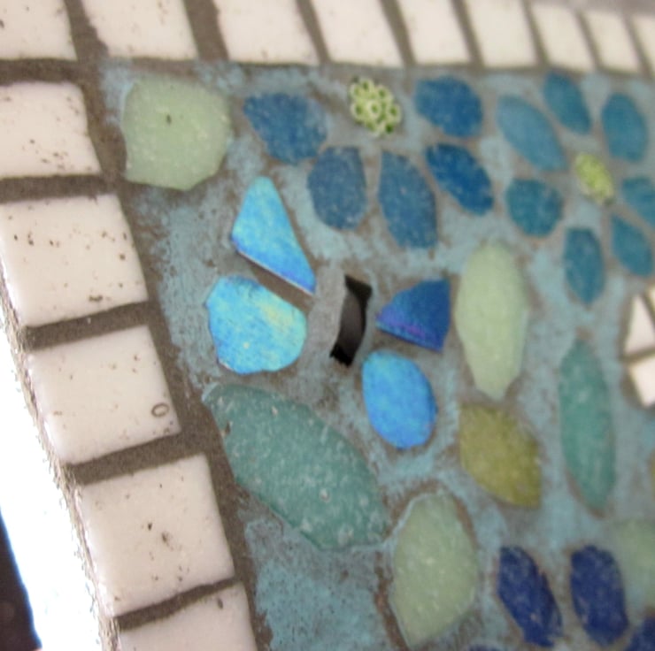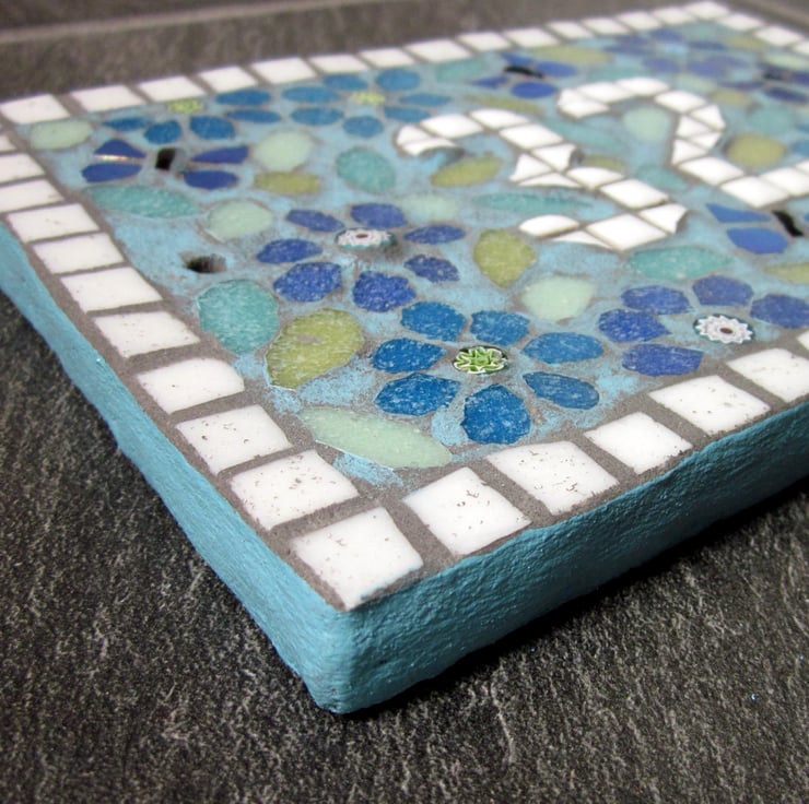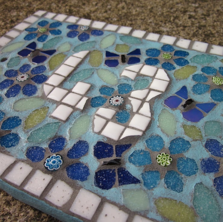 A handcut weatherproofed base with a mosaic made with vitreous glass tiles and finished in a light grey grout designed to repel algae and mold, then overpainted with weatherproof paint. Size - around 19cm wide x 14.5cm tall x 1.5cm deep.