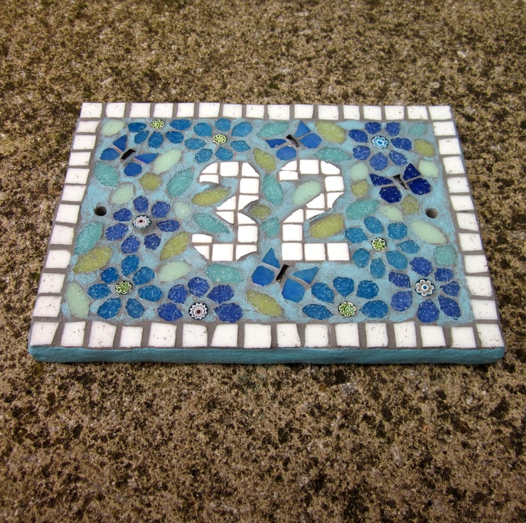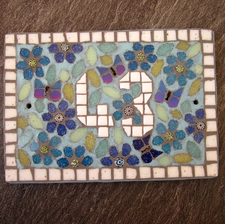 This listing is for a double or triple digit number. The idea for this house number plaque was to create a mosaic that had the look of a liberty style fabric. The plaque base is handcut with handpainted sides, and two screw holes. The same paint is used roughly on the mosaic design to help create the vintage fabric look. This colour version has turquoise and blue flowers, with iridescent blue butterflies that shine with metallic colours, and shades of pastel green leaves, finished with a light sky blue paint.