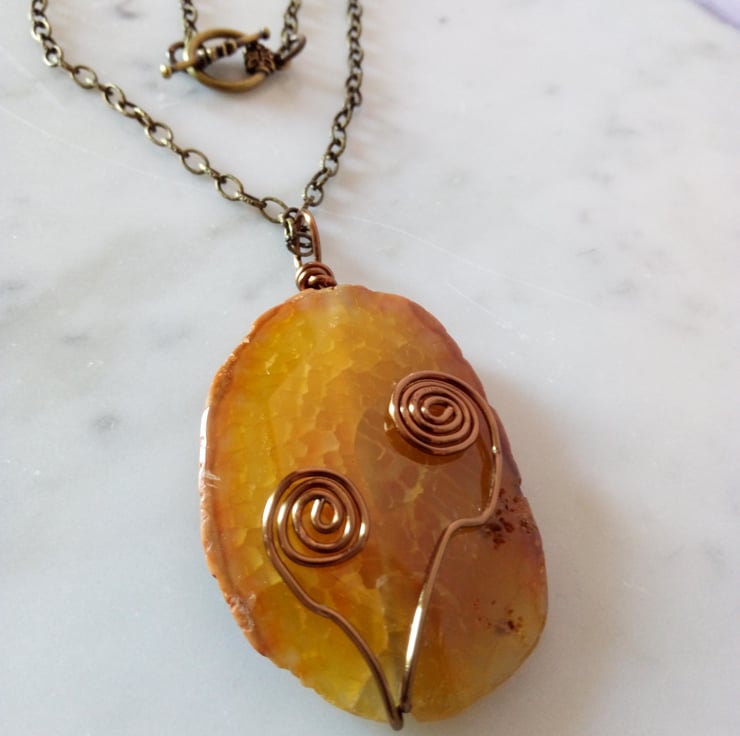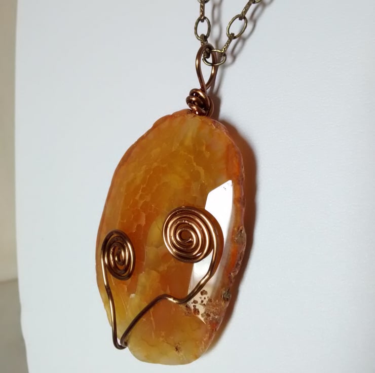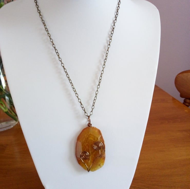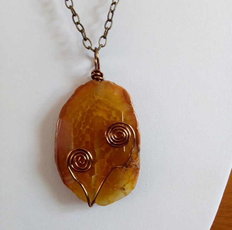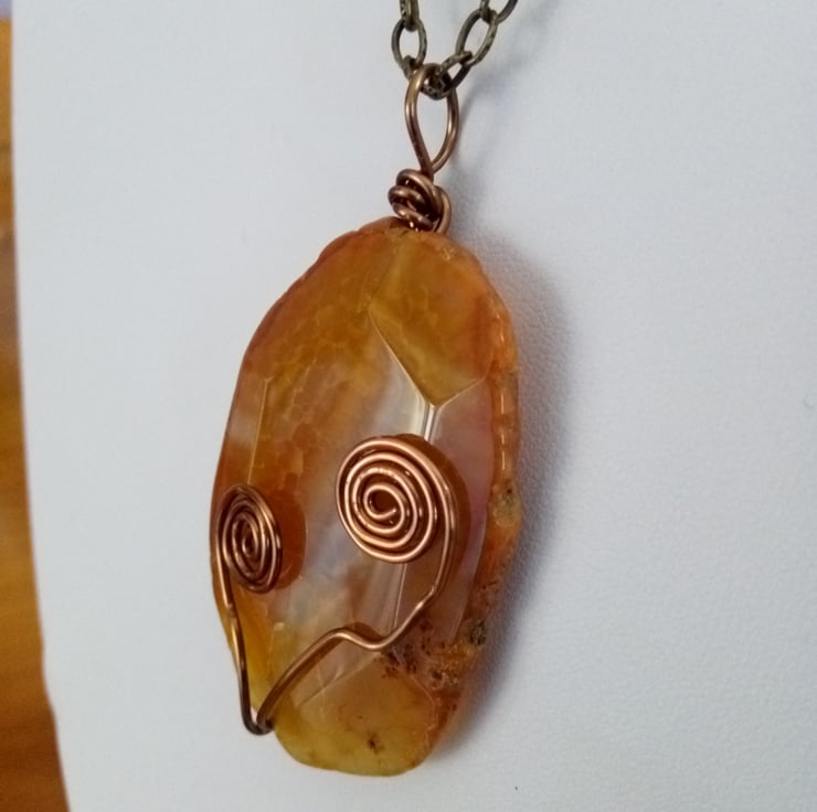 Here we have a lovely Orange Crackled Faceted Organic Slab with Antique Bronze Swirls. Hangs from a Antique Bronze Chain and Flower Toggle.