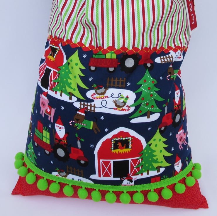 Made from a patchwork of carefully selected prints in quality 100% cotton quilting fabric. The main panel is Santa's Farm by Michael Miller; the backround fabrics and the colours of pom-poms and ric-rac may vary from the photo but will all co-ordinate. It is fully lined with cotton and has a hanging loop.