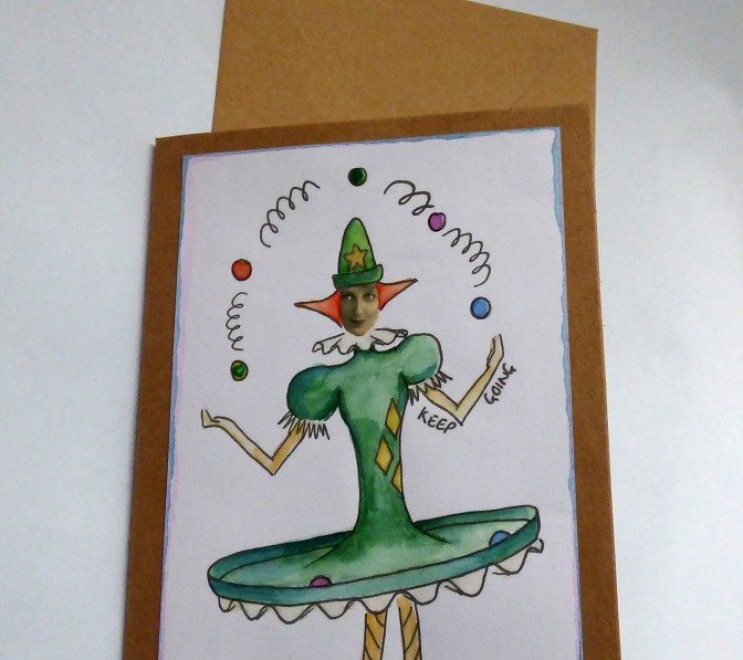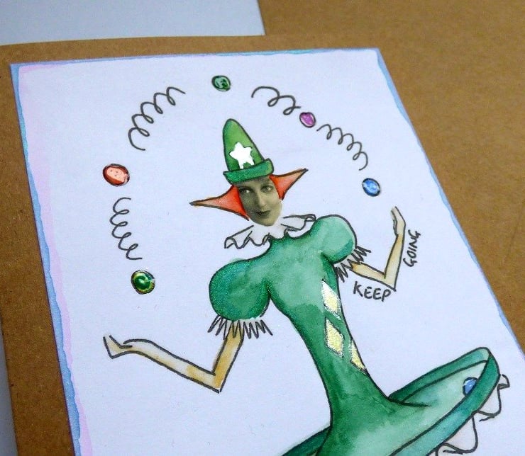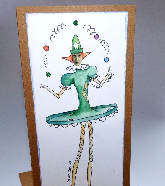 My juggler image has been water coloured by hand in shades of green and sepia to give an old fashioned feel and I've added some shimmer to some details on her hat and dress.