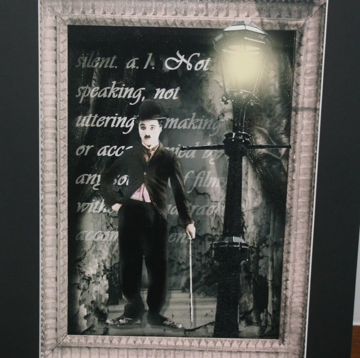 I have used an image of an old stage, the stage shows Chaplin himself as his most popular character, The Tramp. Ive added a lit lamp post which featured in his films, behind him is the definition of the word "silent".