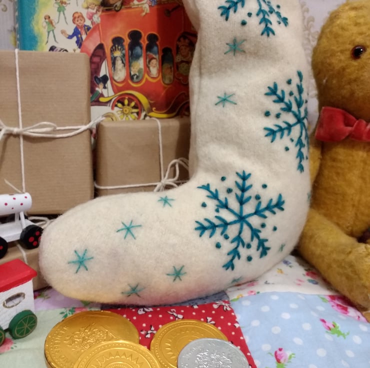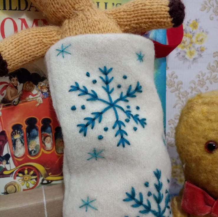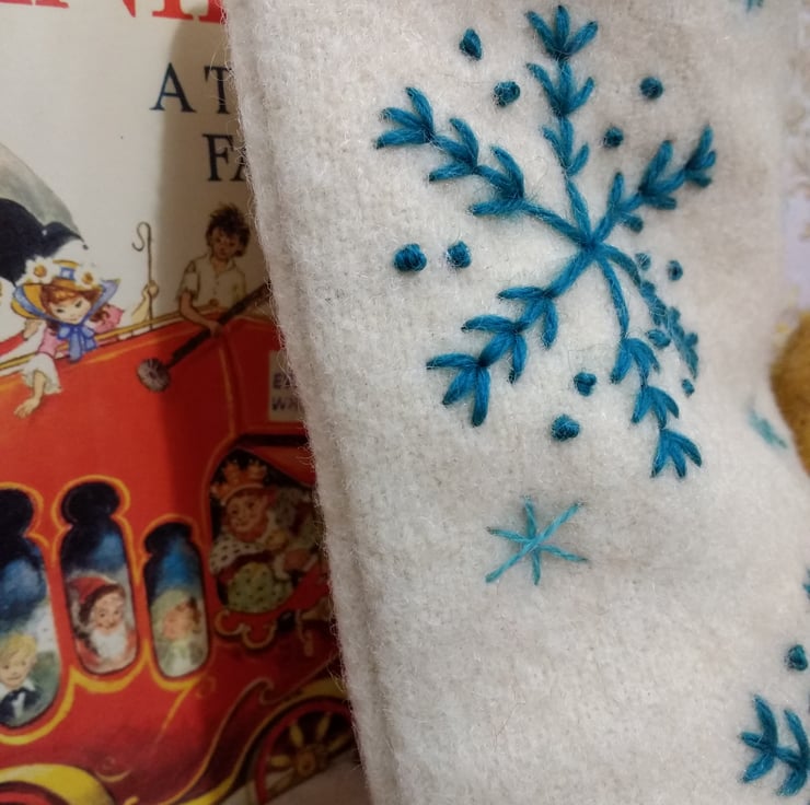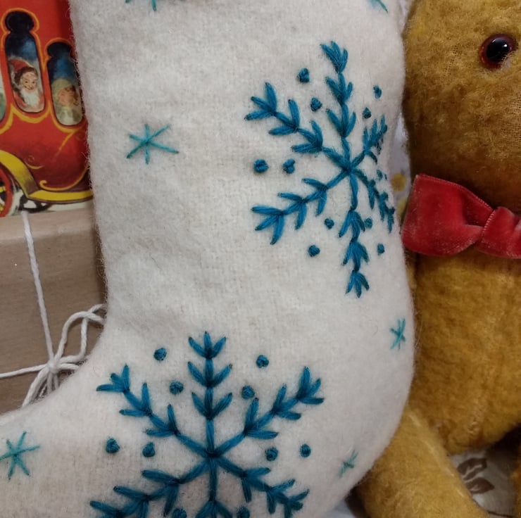 Hand embroidered using a selection of vintage tapestry wool and threads with an assortment of teal blue snowflakes and stars.