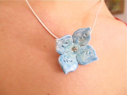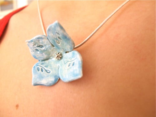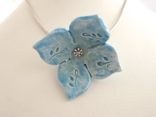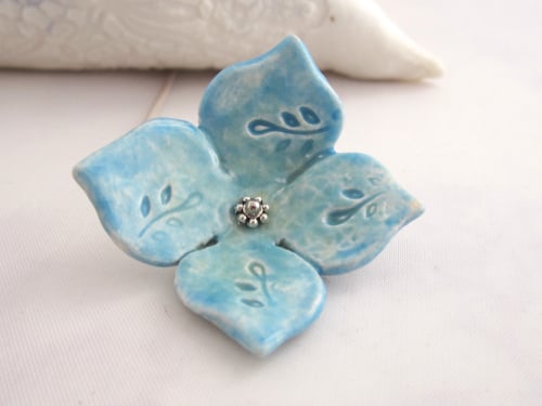 A delicate hand shaped and textured ceramic flower, glazed in gorgeous pale blue.