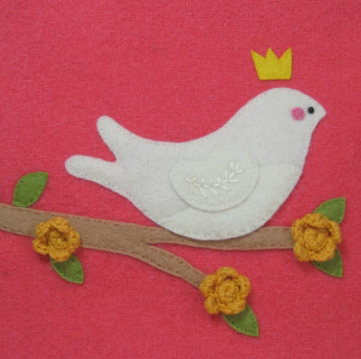 The bird applique on the front is hand stitched, including the bird's rosy little cheeks, and uses 100% pure wool felt.