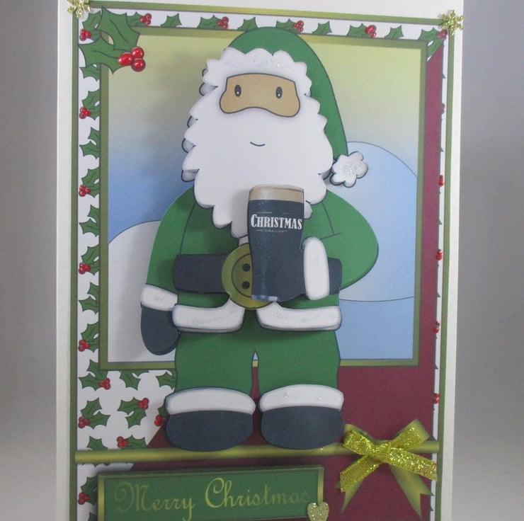 A card measuring approximately 145x210mm(5.5x8.25in) features a Santa from Ireland holding his drink of Christmas draught that a child has left for him!
