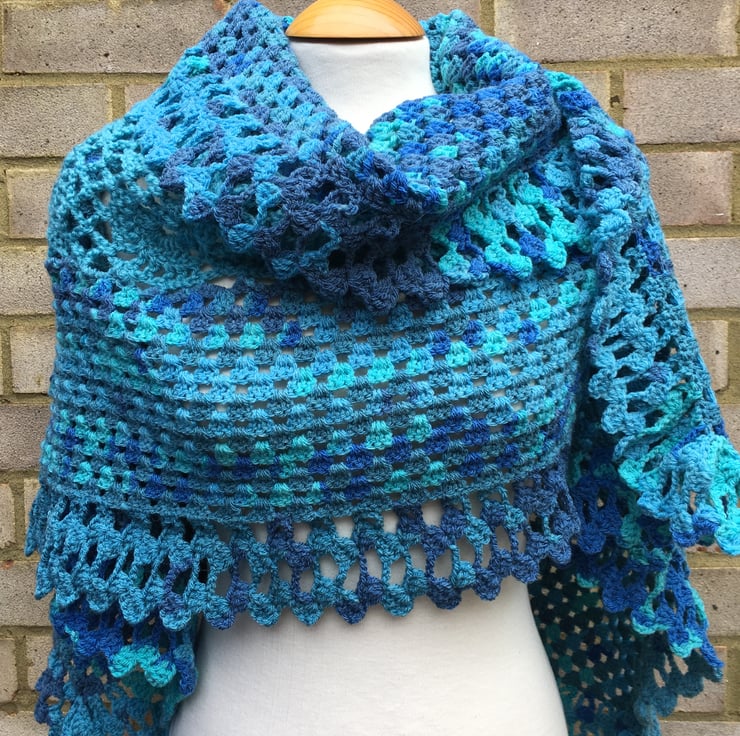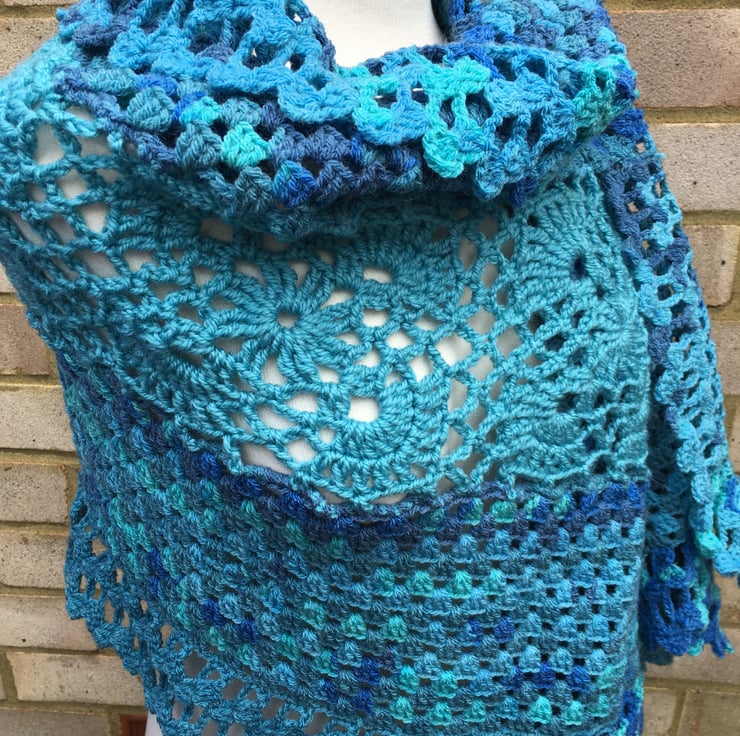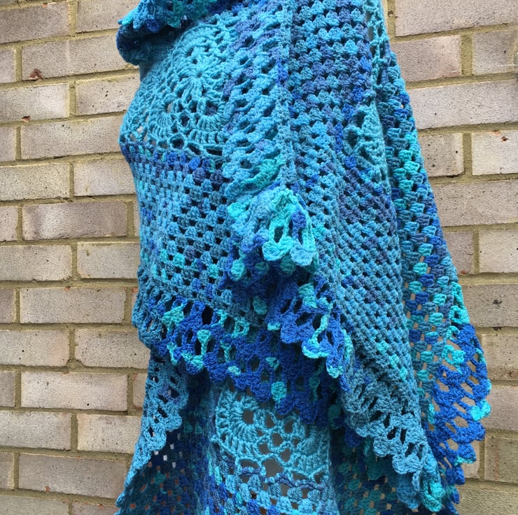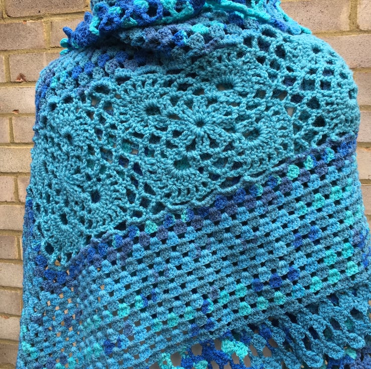 The shawl has been made with two different yarns both containing wool. One yarn is plain sky blue and the other is self patterning in turquoise blues.