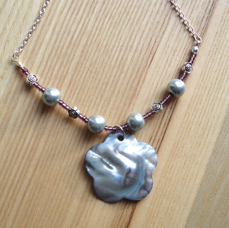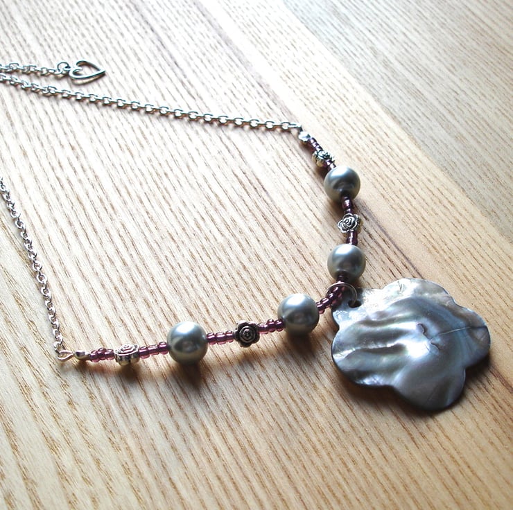 This chic necklace features a lovely range of glass beads. These are interspaced with tibetan silver beads. The beads are strung so that they form a central section, with silver plated chain and a shell pendant added to complete the necklace. Necklace fastens with a tibetan silver toggle clasp. Length is 17.5 inches.